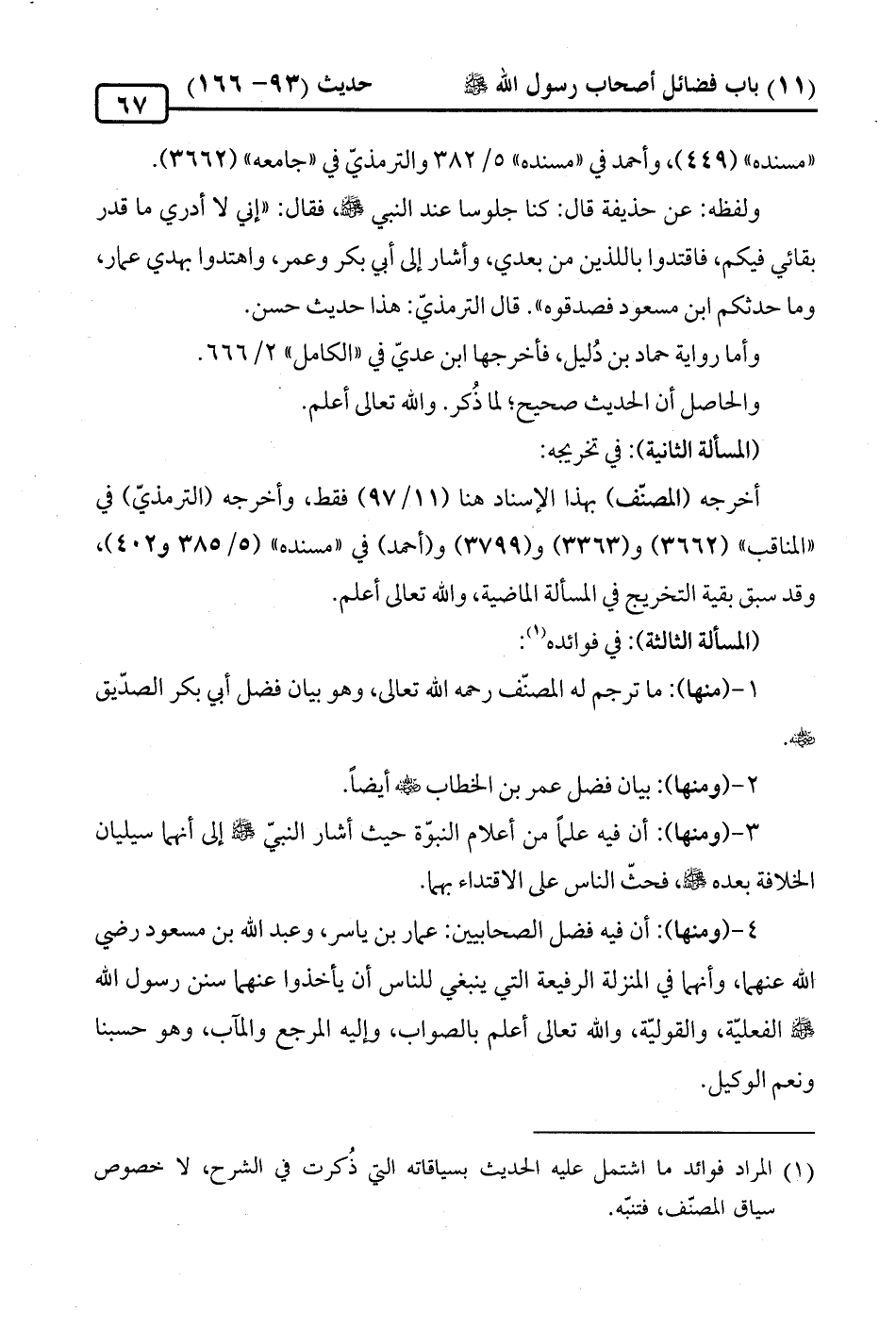 ولفظه: عن حذيفة قال: كنا جلوسا عند النبي -صلى الله عليه وسلم-، فقال: "إني لا أدري ما قدر بقائي فيكم، فاقتدوا باللذين من بعدي، وأشار إلى أبي بكر وعمر، واهتدوا بهدي عمار، وما حدثكم ابن مسعود فصدقوه". قال الترمذيّ: هذا حديث حسن.