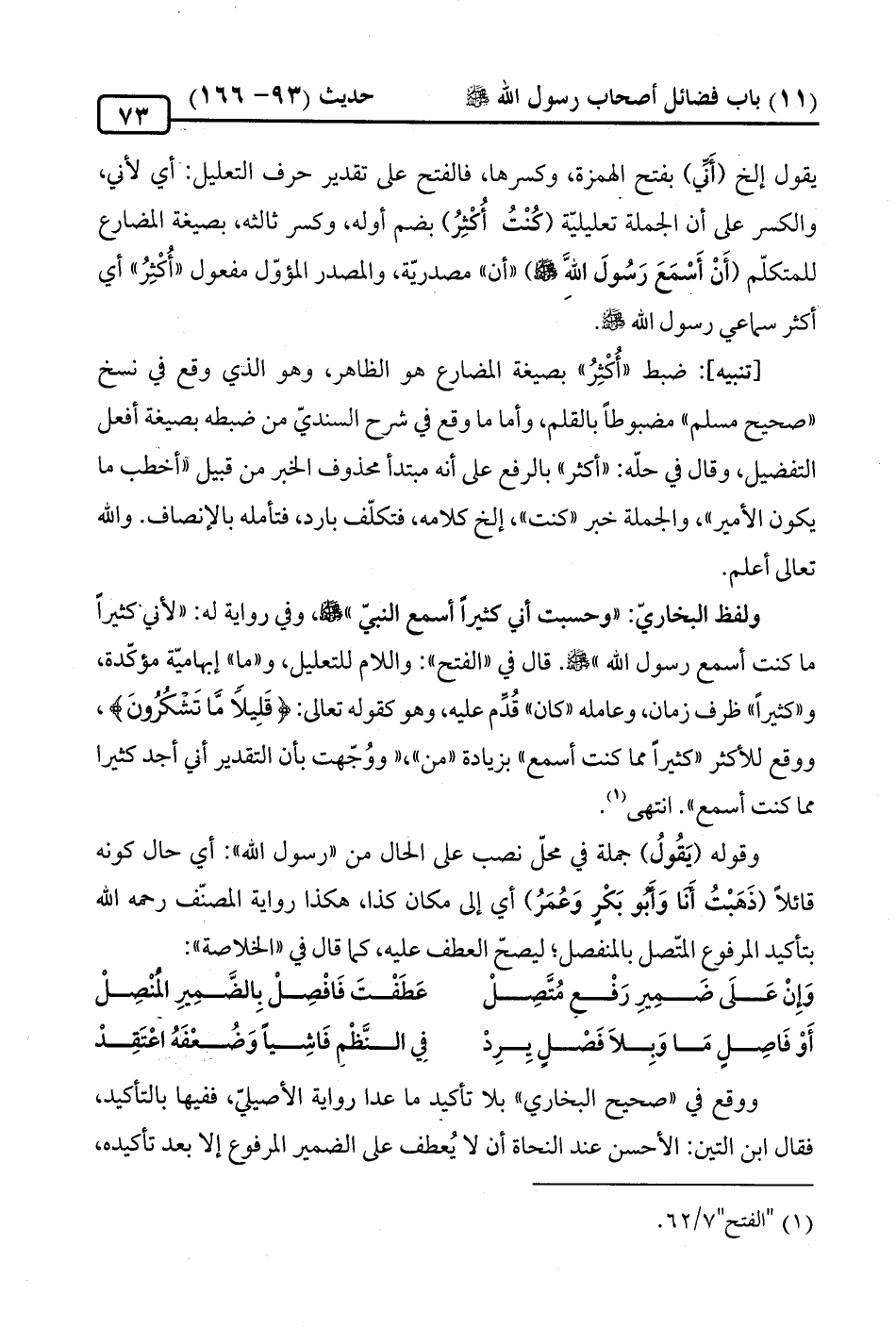 يقول إلخ (أَنِّي) بفتح الهمزة، وكسرها، فالفتح على تقدير حرف التعليل: أي لأني، والكسر على أن الجملة تعليلية (كنْتُ أُكْثِرُ) بضم أوله، وكسر ثالثه، بصيغة المضارع للمتكلّم (أَنْ أسمعَ رَسُولَ الله -صلى الله عليه وسلم-) "أن" مصدريّة، والمصدر المؤوّل مفعول "أُكْثِرُ" أي أكثر سماعي رسول الله -صلى الله عليه وسلم-.