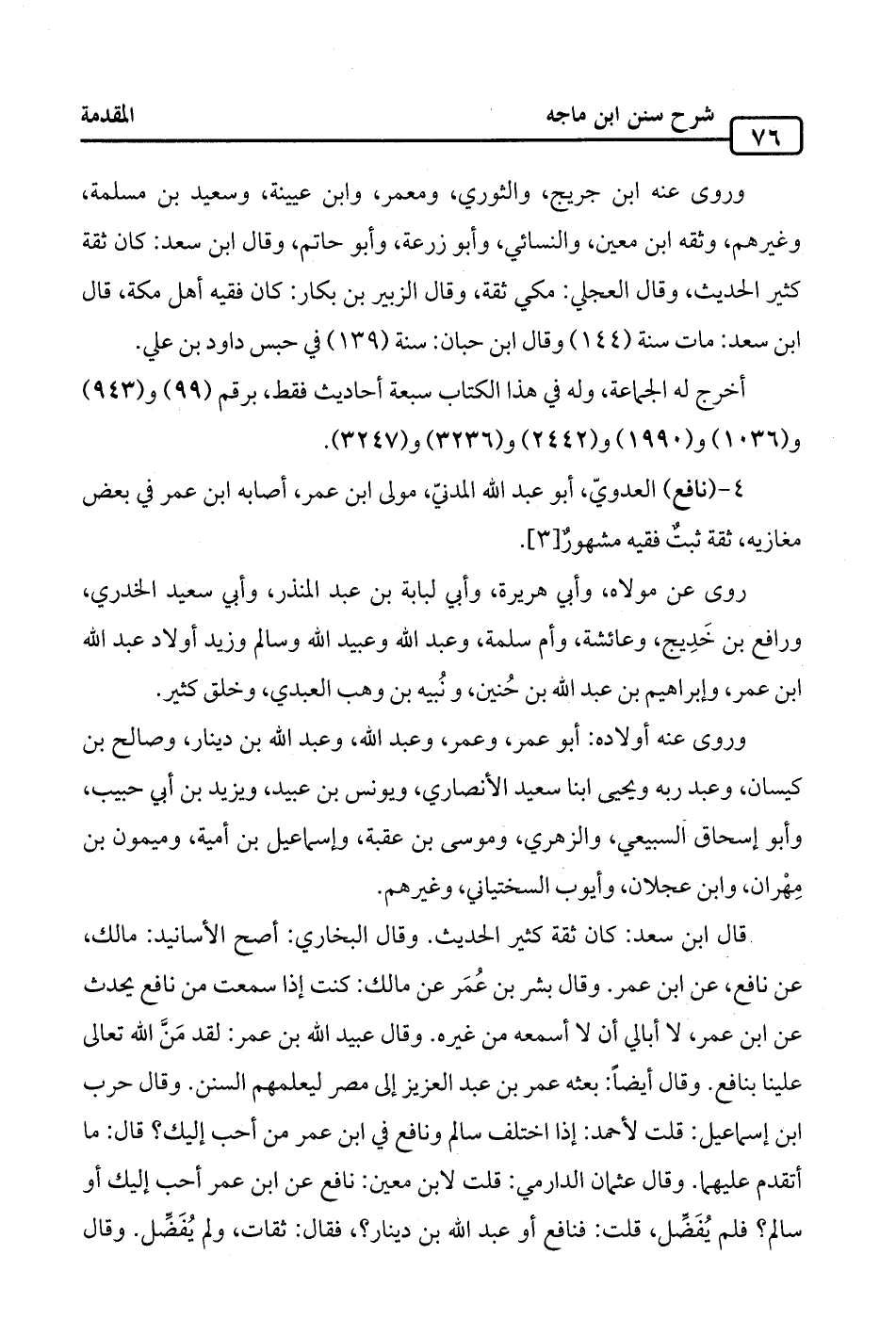 4 - (نافع) العدويّ، أَبو عبد الله المدنيّ، مولى ابن عمر، أصابه ابن عمر في بعض مغازيه، ثقة ثبتٌ فقيه مشهورٌ [3].