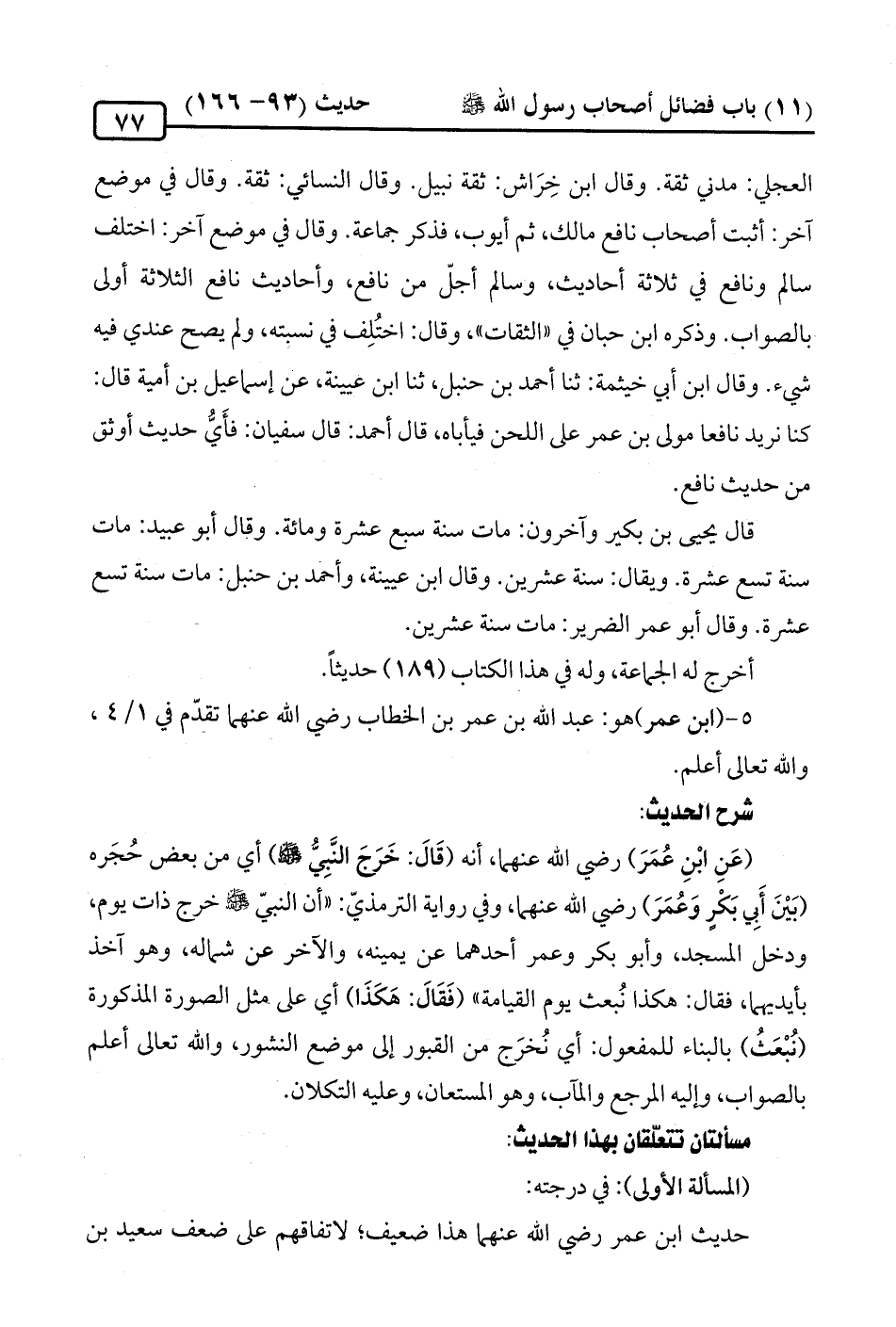 (عَنِ ابْنِ عُمَرَ) رضي الله عنهما، أنه (قَالَ: خَرَجَ النَّبِيُّ -صلى الله عليه وسلم-) أي من بعض حُجَره (بَيْنَ أَبِي بَكْرٍ وَعُمَرَ) رضي الله عنهما، وفي رواية الترمذيّ: "أن النبيّ صلى الله عليه وسلم خرج ذات يوم، ودخل المسجد، وأبو بكر وعمر أحدهما عن يمينه، والآخر عن شماله، وهو آخذ بأيديهما، فقال: هكذا نُبعث يوم القيامة" (فَقَالَ: هَكَذَا) أي على مثل الصورة المذكورة (نُبْعَثُ) بالبناء للمفعول: أي نُخرَج من القبور إلى موضع النشور، والله تعالى أعلم بالصواب، وإليه المرجع والمآب، وهو المستعان، وعليه التكلان.