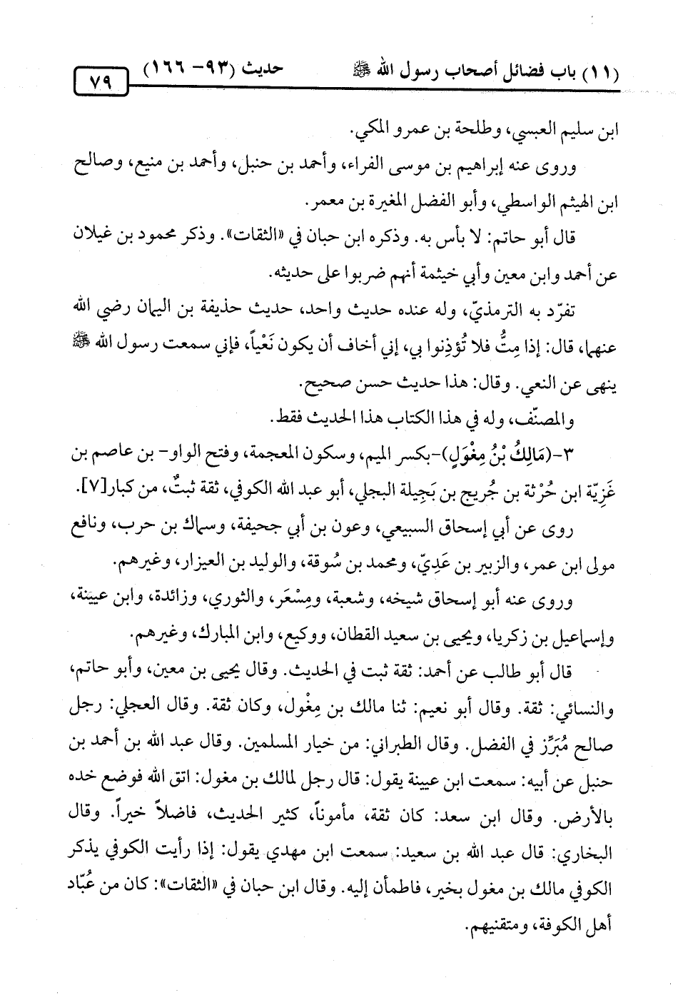 3 - (مَالِكُ بْنُ مِغْوَلٍ) -بكسر اليم، وسكون المعجمة، وفتح الواو- بن عاصم بن غَزِيّة ابن حُرْثة بن جُريج بن بَجِيلة البجلي، أَبو عبد الله الكوفي، ثقة ثبتٌ، من كبار [7].