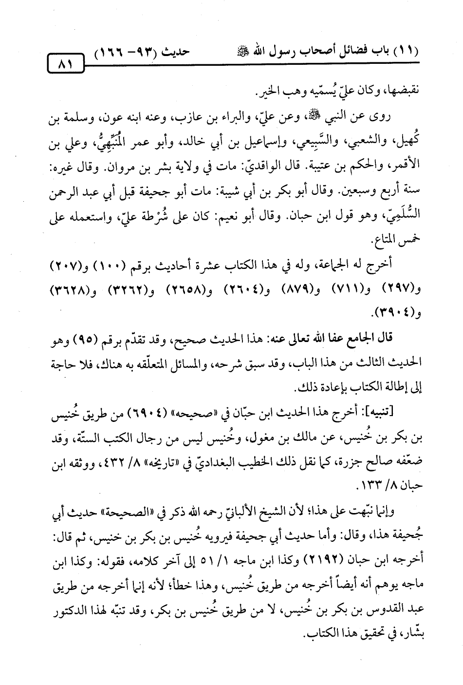وإنما نبّهت على هذا؛ لأن الشيخ الألبانيّ رحمه الله ذكر في "الصحيحة" حديث أبي جُحيفة هذا، وقال: وأما حديث أبي جحيفة فيرويه خُنيس بن بكر بن خنيس، ثم قال: أخرجه ابن حبان (2192) وكذا ابن ماجه 1/ 51 إلى آخر كلامه، فقوله: وكذا ابن ماجه يوهم أنه أيضًا أخرجه من طريق خُنيس، وهذا خطأ؛ لأنه إنما أخرجه من طريق عبد القدوس بن بكر بن خُنيس، لا من طريق خُنيس بن بكر، وقد تنبّه لهذا الدكتور بشّار، في تحقيق هذا الكتاب.