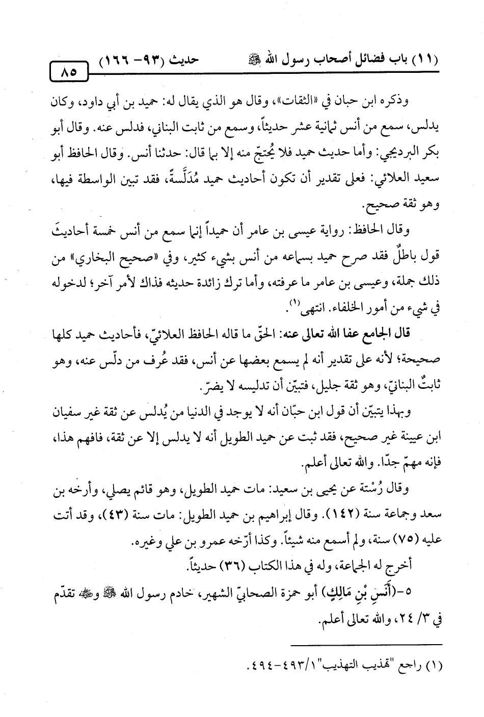 قال الجامع عفا الله تعالى عنه: الحقّ ما قاله الحافظ العلائيّ، فأحاديث حميد كلها صحيحة؛ لأنه على تقدير أنه لم يسمع بعضها عن أنس، فقد عُرف من دلّس عنه، وهو ثابتٌ البنانيّ، وهو ثقة جليل، فتبيّن أن تدليسه لا يضرّ.