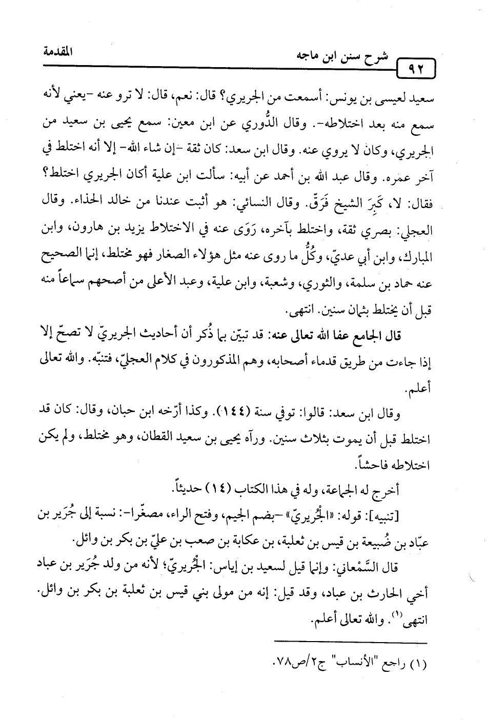 سعيد لعيسى بن يونس: أسمعت من الجريري؟ قال: نعم، قال: لا ترو عنه -يعني لأنه سمع منه بعد اختلاطه-. وقال الدُّوري عن ابن معين: سمع يحيى بن سعيد من الجريري، وكان لا يروي عنه. وقال ابن سعد: كان ثقة -إن شاء الله- إلا أنه اختلط في آخر عمره. وقاله عبد الله بن أحمد عن أبيه: سألت ابن علية أكان الجريري اختلط؟ فقال: لا، كَبِرَ الشيخ فَرَقّ. وقال النسائي: هو أثبت عندنا من خالد الحذاء. وقال العجلي: بصري ثقة، واختلط بآخره، رَوَى عنه في الاختلاط يزيد بن هارون، وابن المبارك، وابن أبي عديّ، وكُلُّ ما روى عنه مثل هؤلاء الصغار فهو مختلط، إنما الصحيح عنه حماد بن سلمة، والثوري، وشعبة، وابن علية، وعبد الأعلى من أصحهم سماعًا منه قبل أن يختلط بثمان سنين. انتهى.