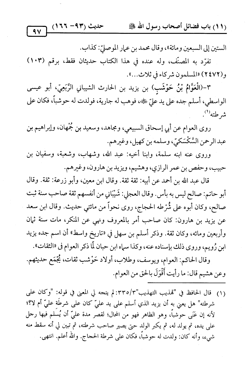 3 - (الْعَوَّامُ بْنُ حَوْشَبٍ) بن يزيد بن الحارث الشيباني الرَّبَعِيّ، أَبو عيسى الواسطي، أسلم جده على يد عليّ -رضي الله عنه-، فوهب له جارية، فولدت له حوشبًا، فكان على شرطته (¬1).