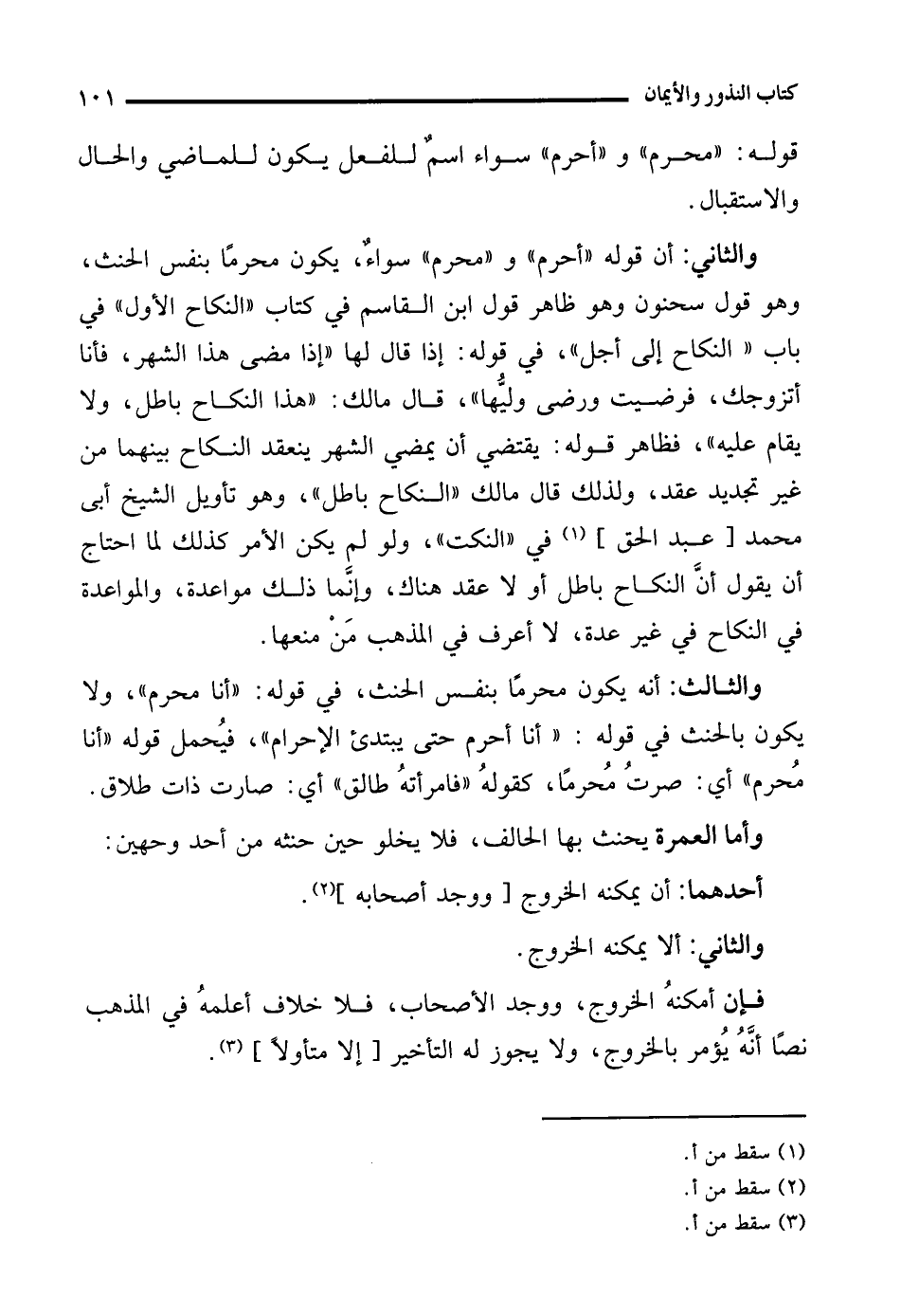 والثالث: أنه يكون محرمًا بنفس الحنث، في قوله: "أنا محرم"، ولا يكون بالحنث في قوله: "أنا أحرم حتى يبتدئ الإحرام"، فيُحمل قوله "أنا مُحرم" أي: صرتُ مُحرمًا، كقولهُ "فامرأتهُ طالق" أي: صارت ذات طلاق.