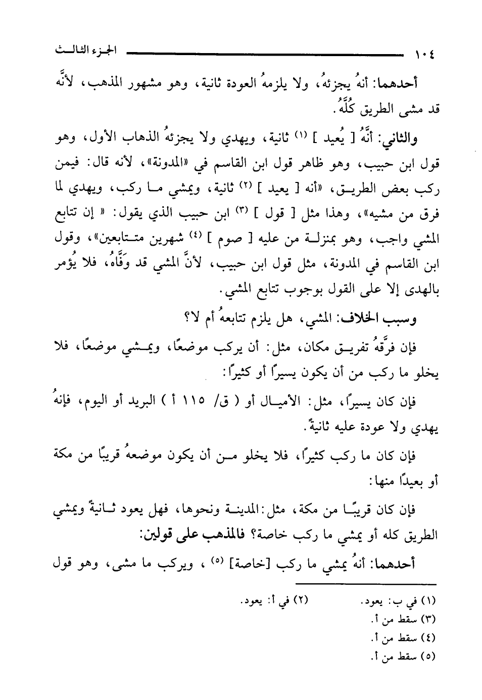 والثاني: أنَّهُ [يُعيد] (¬1) ثانية، ويهدي ولا يجزئهُ الذهاب الأول، وهو قول ابن حبيب، وهو ظاهر قول ابن القاسم في "المدونة"، لأنه قال: فيمن ركب بعض الطريق، "أنه [يعيد] (¬2) ثانية، ويمشي ما ركب، ويهدي لما فرق من مشيه"، وهذا مثل [قول] (¬3) ابن حبيب الذي يقول: "إن تتابع المشي واجب، وهو بمنزلة من عليه [صوم] (¬4) شهرين متتابعين"، وقول ابن القاسم في المدونة، مثل قول ابن حبيب، لأنَّ المشي قد وَفَّاهُ، فلا يُؤمر بالهدى إلا على القول بوجوب تتابع المشي.