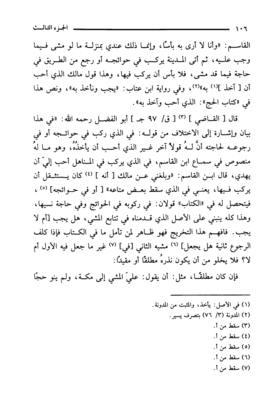 القاسم: "وأنا لا أرى به بأسًا، وإنما ذلك عندي بمنزلة ما لو مشى فيما وجب عليه، ثم أتى المدينة يركب في حوائجه أو رجع من الطريق في حاجة فيما قد مشى، فلا بأس أن يركب فيها، وهذا قول مالك الذي أحب أن [آخذ] (¬1) به" (¬2)، وفي رواية ابن عتاب: "يجب ونأخذ به"، ونص هذا في "كتاب الحج": الذي أحب وآخذ به".
