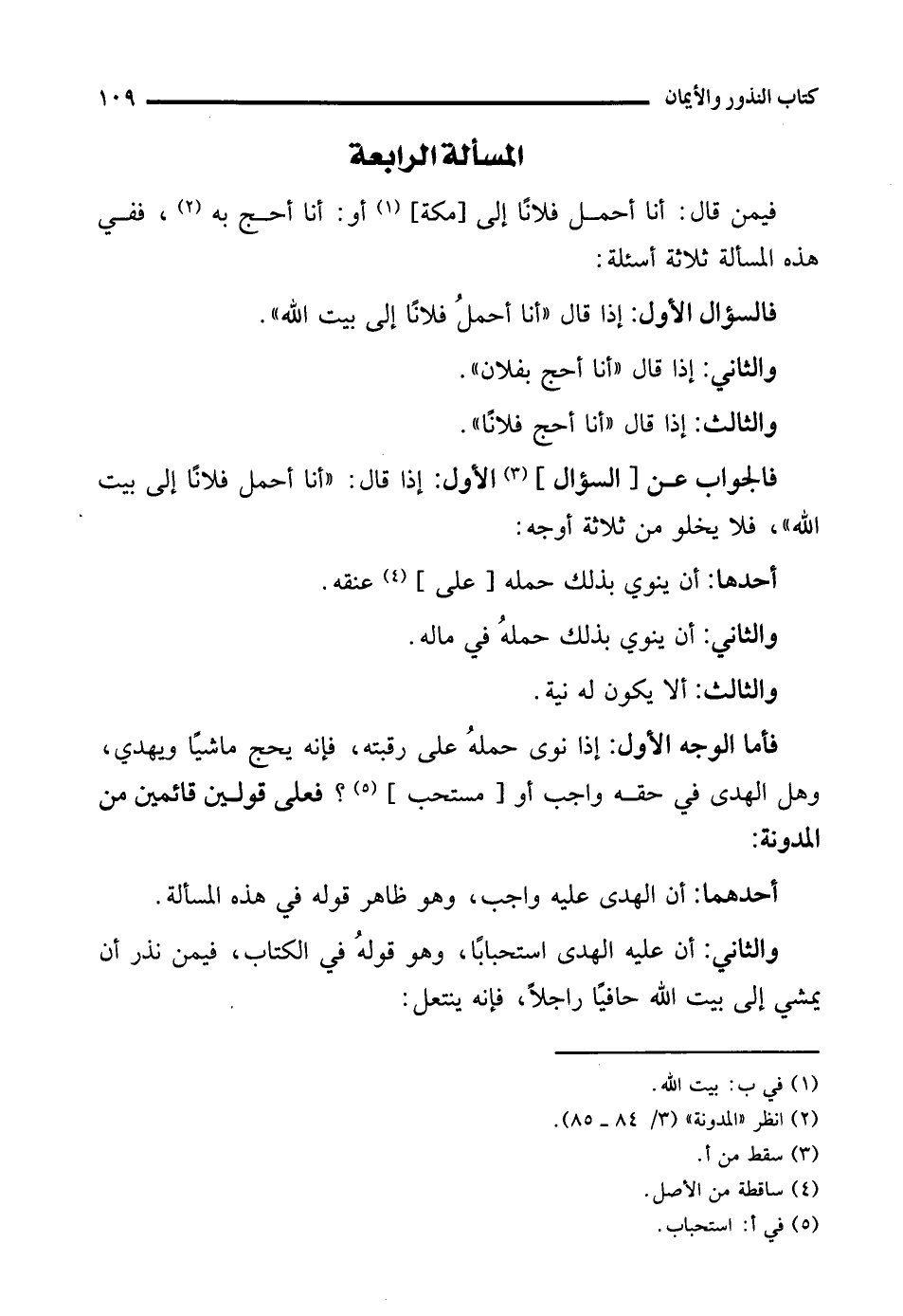 فيمن قال: أنا أحمل فلانًا إلى [مكة] (¬1) أو: أنا أحج به (¬2)، ففي هذه المسألة ثلاثة أسئلة: