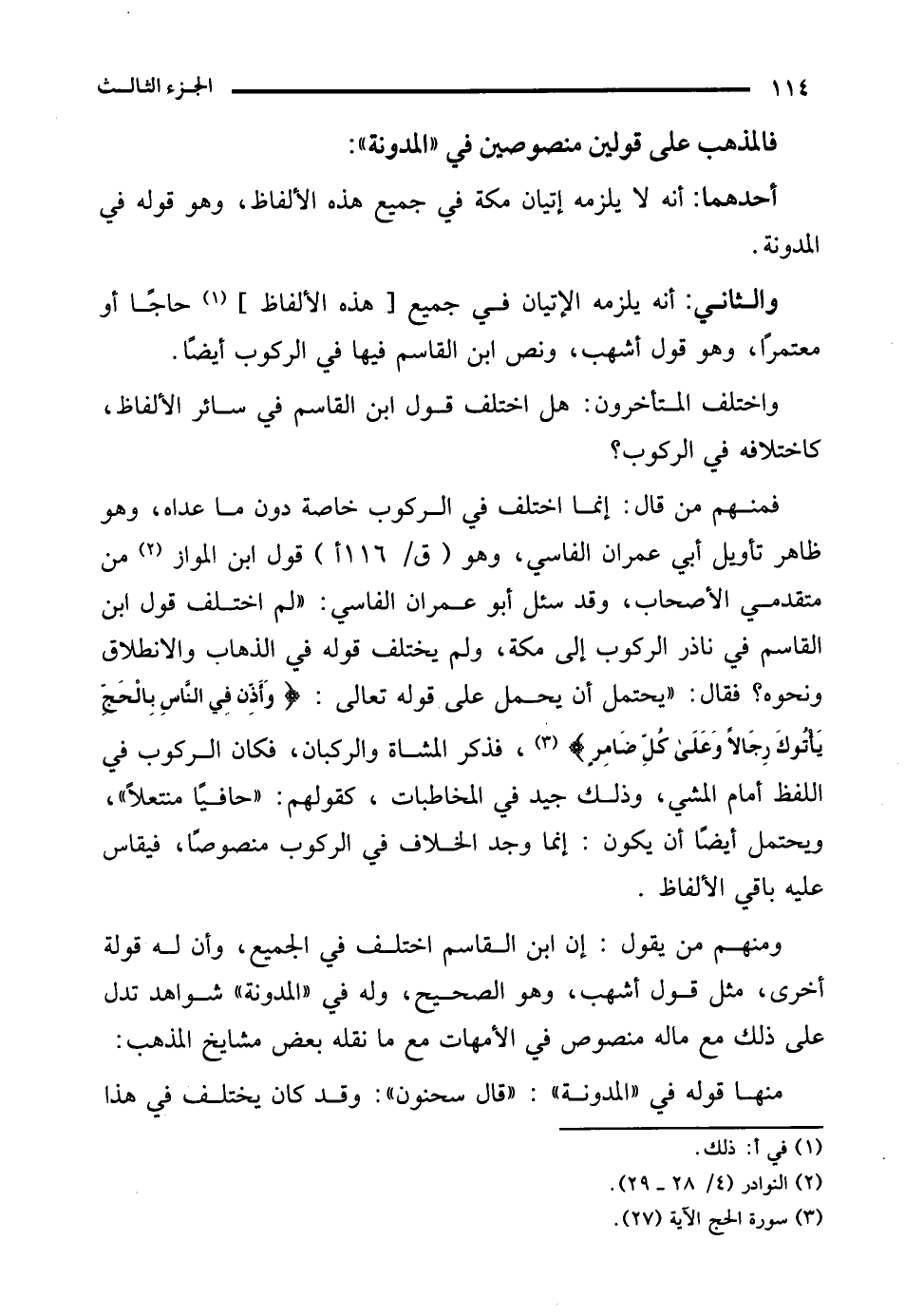 فمنهم من قال: إنما اختلف في الركوب خاصة دون ما عداه، وهو ظاهر تأويل أبي عمران الفاسي، وهو قول ابن المواز (¬2) من متقدمي الأصحاب، وقد سئل أبو عمران الفاسي: "لم اختلف قول ابن القاسم في ناذر الركوب إلى مكة، ولم يختلف قوله في الذهاب والانطلاق ونحوه؟ فقال: "يحتمل أن يحمل على قوله تعالى: {وَأَذِّنْ فِي النَّاسِ بِالْحَجِّ يَأْتُوكَ رِجَالًا وَعَلَى كُلِّ ضَامِرٍ} (¬3)، فذكر المشاة والركبان، فكان الركوب في اللفظ أمام المشي، وذلك جيد في المخاطبات، كقولهم: "حافيًا منتعلًا"، ويحتمل أيضًا أن يكون: إنما وجد الخلاف في الركوب منصوصًا، فيقاس عليه باقي الألفاظ.