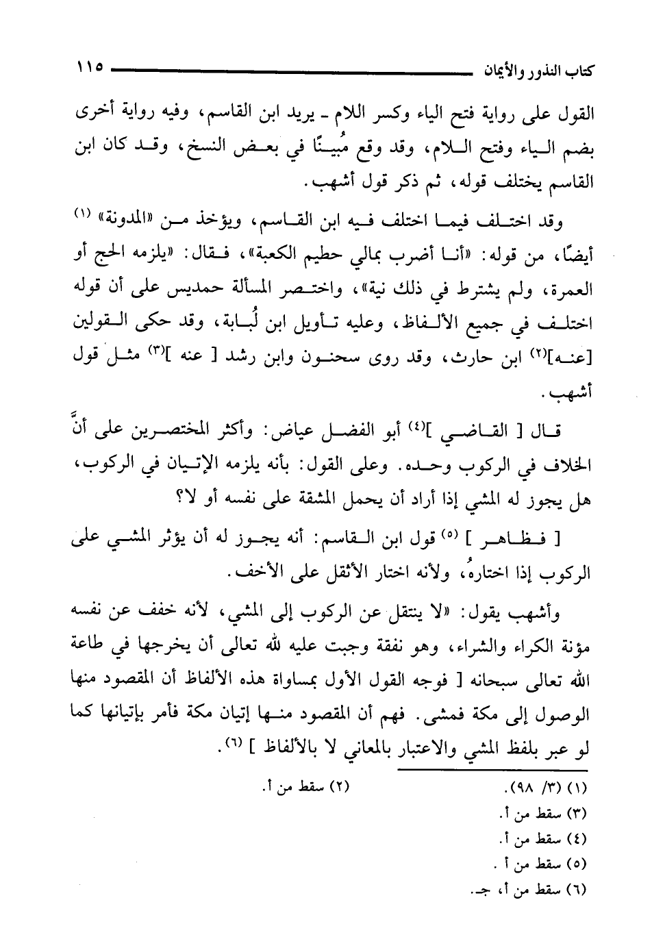 وأشهب يقول: "لا ينتقل عن الركوب إلى المشي، لأنه خفف عن نفسه مؤنة الكراء والشراء، وهو نفقة وجبت عليه لله تعالى أن يخرجها في طاعة الله تعالى سبحانه [فوجه القول الأول بمساواة هذه الألفاظ أن المقصود منها الوصول إلى مكة فمشى. فهم أن المقصود منها إتيان مكة فأمر بإتيانها كما لو عبر بلفظ المشي والاعتبار بالمعاني لا بالألفاظ] (¬6).