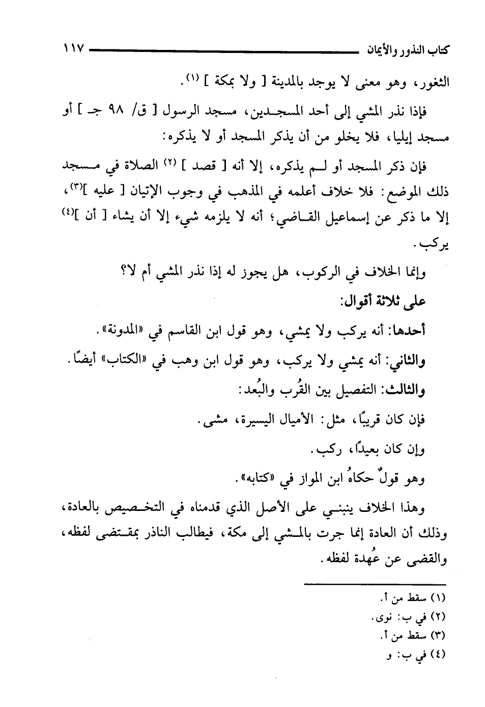 فإذا نذر المشي إلى أحد المسجدين، مسجد الرسول أو مسجد إيليا، فلا يخلو من أن يذكر المسجد أو لا يذكره: