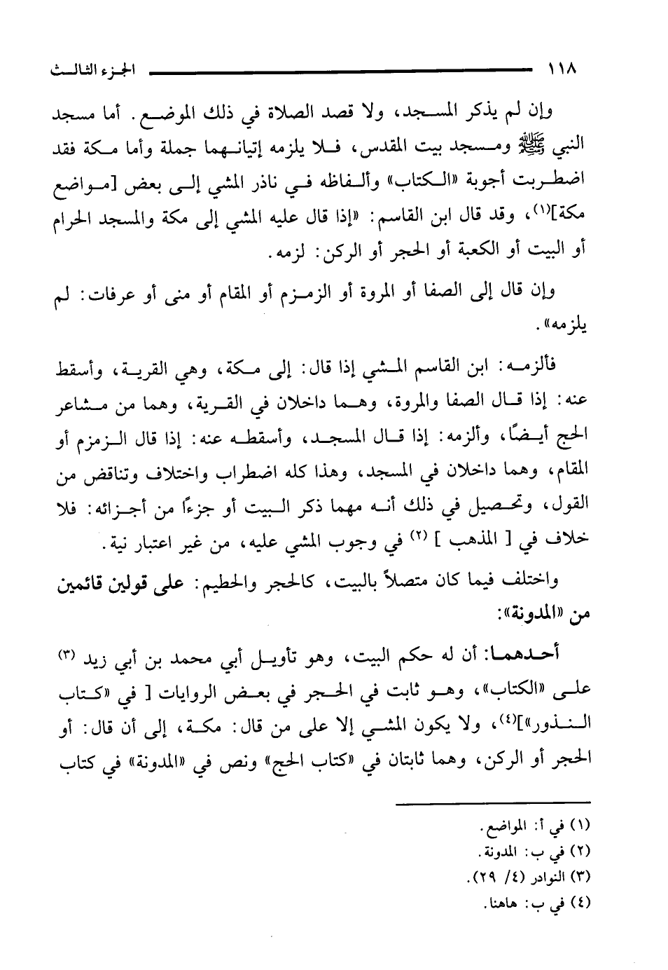 وإن لم يذكر المسجد، ولا قصد الصلاة في ذلك الموضع. أما مسجد النبي - صلى الله عليه وسلم - ومسجد بيت المقدس، فلا يلزمه إتيانهما جملة وأما مكة فقد اضطربت أجوبة "الكتاب" وألفاظه في ناذر المشي إلى بعض [مواضع مكة] (¬1)، وقد قال ابن القاسم: "إذا قال عليه المشي إلى مكة والمسجد الحرام أو البيت أو الكعبة أو الحجر أو الركن: لزمه.