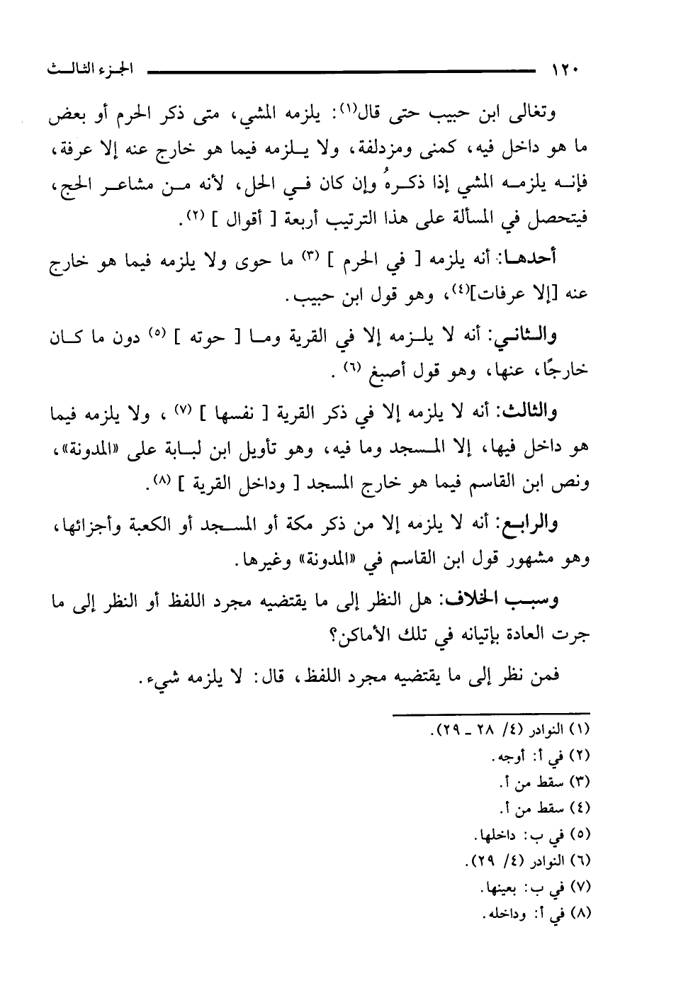 وتغالى ابن حبيب حتى قال (¬1): يلزمه المشي، متى ذكر الحرم أو بعض ما هو داخل فيه، كمنى ومزدلفة، ولا يلزمه فيما هو خارج عنه إلا عرفة، فإنه يلزمه المشي إذا ذكرهُ وإن كان في الحل، لأنه من مشاعر الحج، فيتحصل في المسألة على هذا الترتيب أربعة [أقوال] (¬2).
