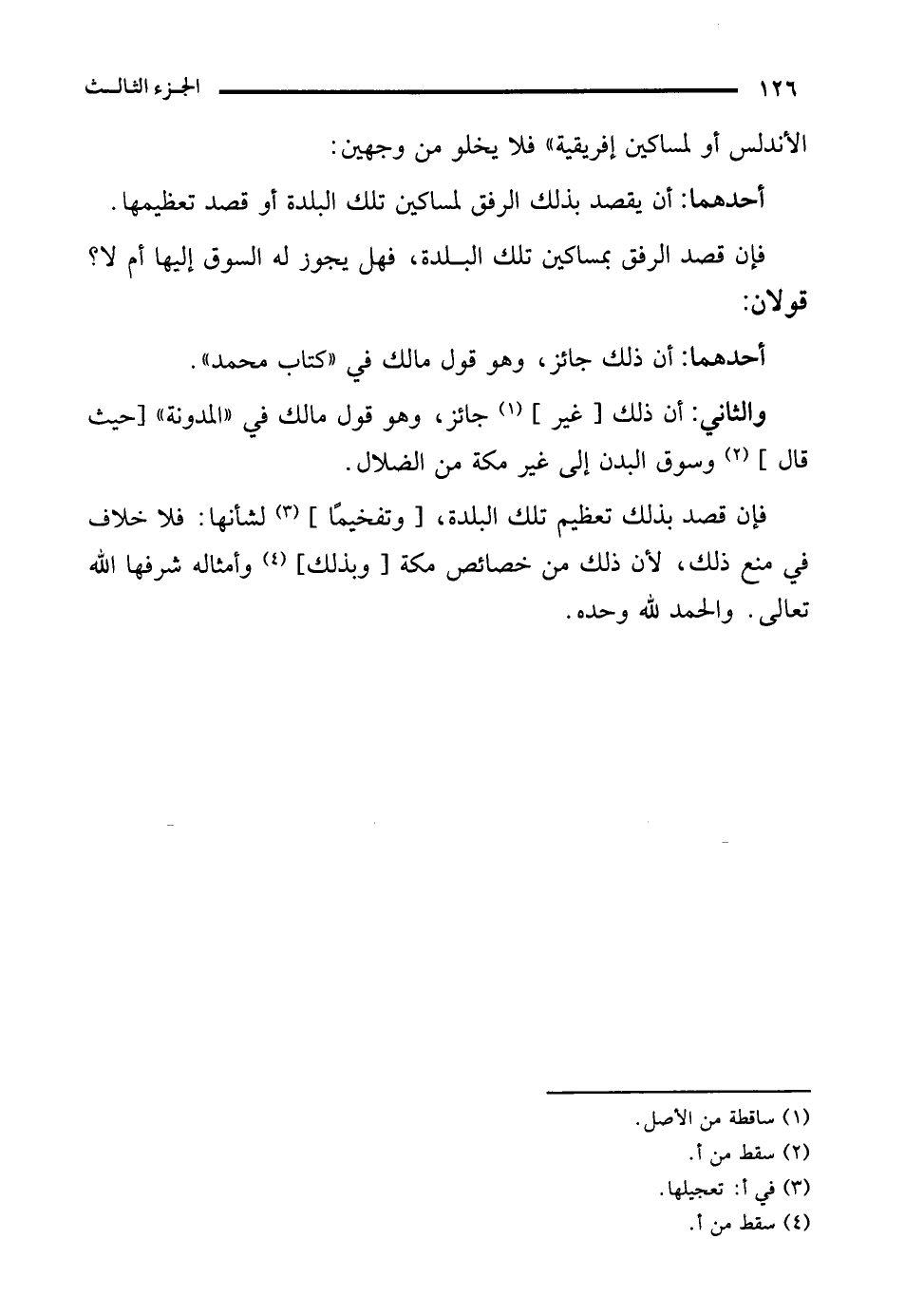 فإن قصد بذلك تعظيم تلك البلدة، [وتفخيمًا] (¬3) لشأنها: فلا خلاف في منع ذلك، لأن ذلك من خصائص مكة [وبذلك] (¬4) وأمثاله شرفها الله تعالى. والحمد لله وحده.