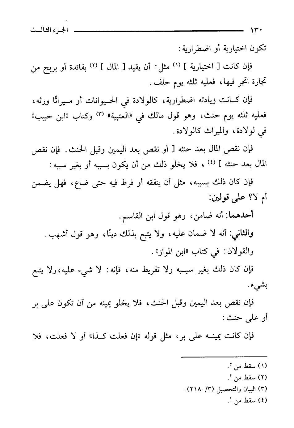 فإن كانت زيادته اضطرارية، كالولادة في الحيوانات أو ميراثًا ورثه، فعليه ثلثه يوم حنث، وهو قول مالك في "العتبية" (¬3) وكتاب "ابن حبيب" في الولادة، والميراث كالولادة.