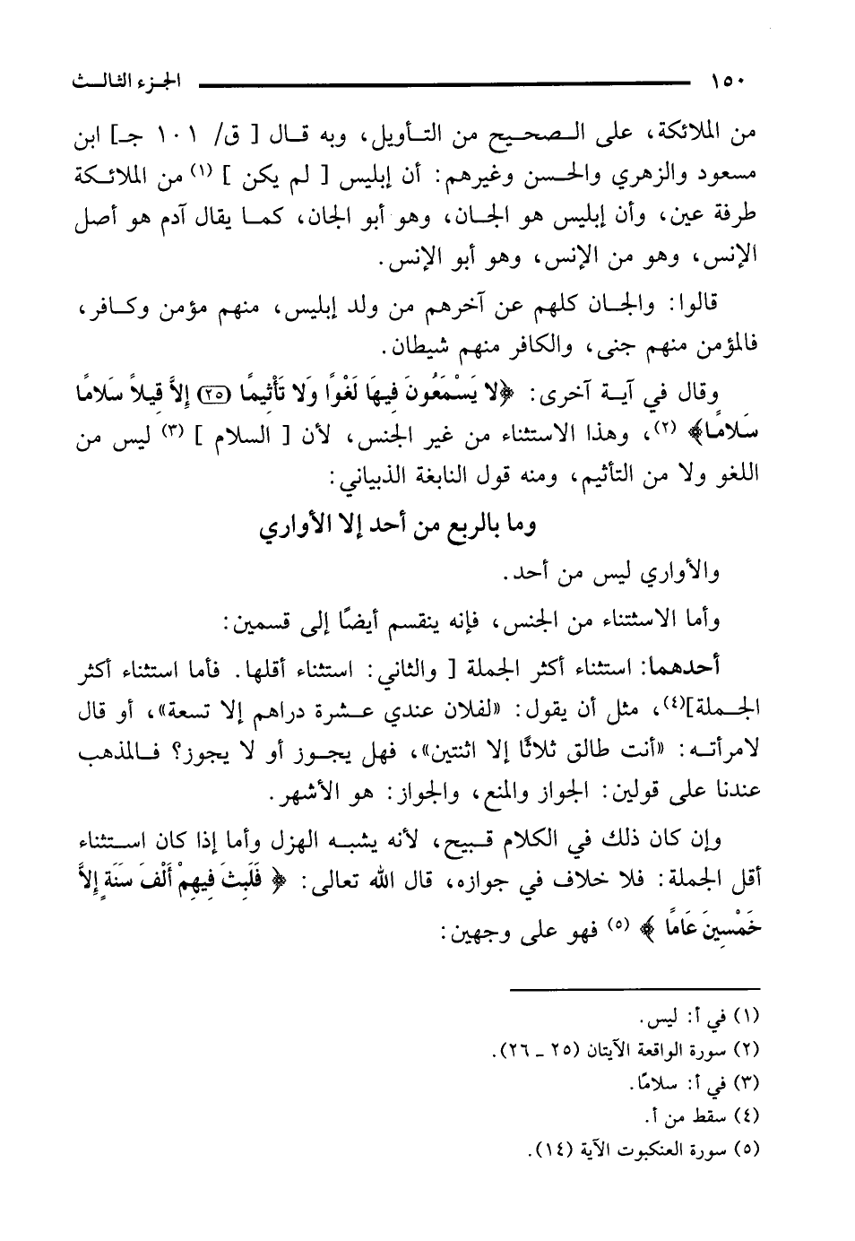 وقال في آية أخرى: {لَا يَسْمَعُونَ فِيهَا لَغْوًا وَلَا تَأْثِيمًا (25) إِلَّا قِيلًا سَلَامًا سَلَامًا} (¬2)، وهذا الاستثناء من غير الجنس، لأن [السلام] (¬3) ليس من اللغو ولا من التأثيم، ومنه قول النابغة الذبياني: