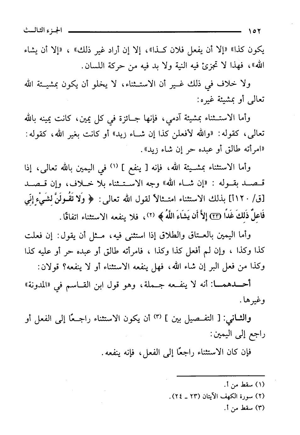 ولا خلاف في ذلك غير أن الاستثناء، لا يخلو أن يكون بمشيئة الله تعالى أو بمشيئة غيره: