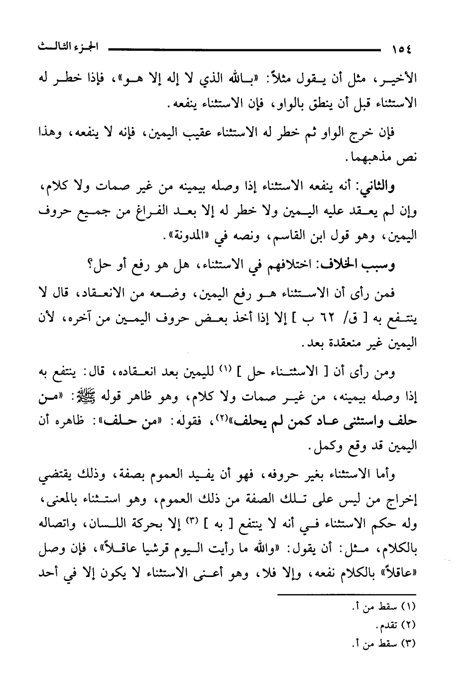 فمن رأى أن الاستثناء هو رفع اليمين، وضعه من الانعقاد، قال لا ينتفع به إلا إذا أخذ بعض حروف اليمين من آخره، لأن اليمين غير منعقدة بعد.