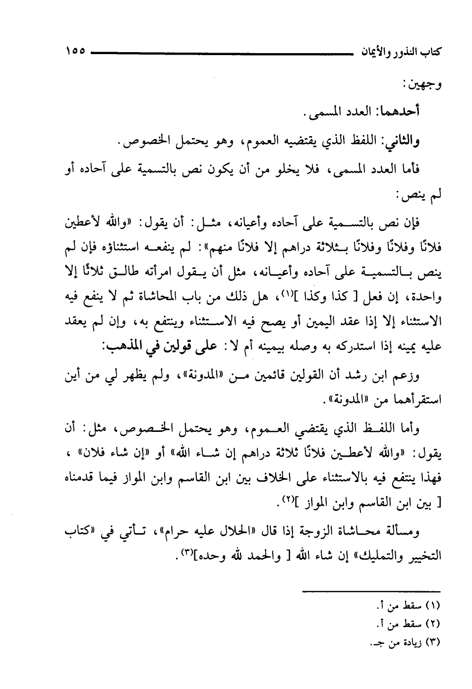 وأما اللفظ الذي يقتضي العموم، وهو يحتمل الخصوص، مثل: أن يقول: "والله لأعطين فلانًا ثلاثة دراهم إن شاء الله" أو "إن شاء فلان"، فهذا ينتفع فيه بالاستثناء على الخلاف بين ابن القاسم وابن المواز فيما قدمناه [بين ابن القاسم وابن المواز] (¬2).