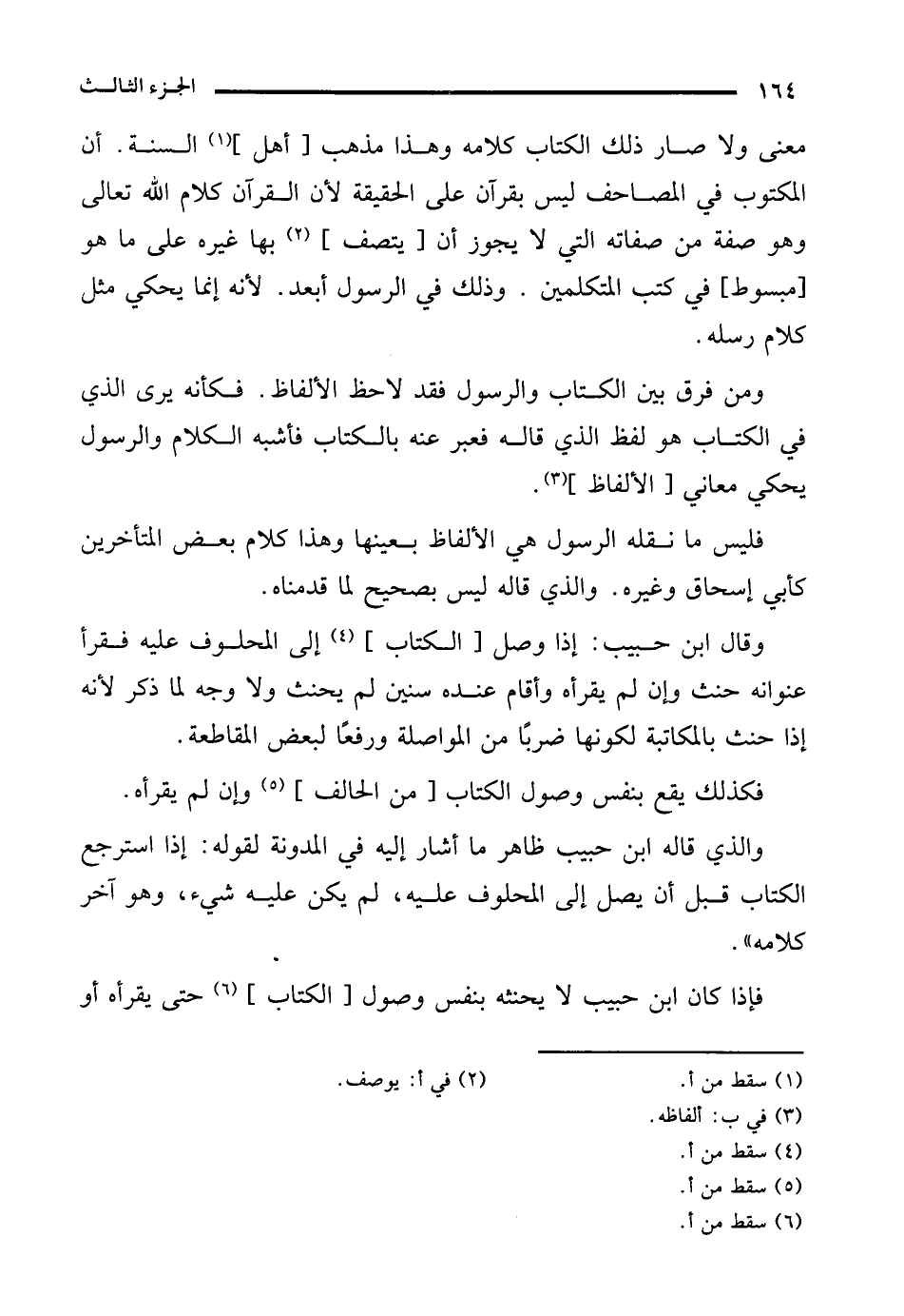 ومن فرق بين الكتاب والرسول فقد لاحظ الألفاظ. فكأنه يرى الذي في الكتاب هو لفظ الذي قاله فعبر عنه بالكتاب فأشبه الكلام والرسول يحكي معاني [الألفاظ] (¬3).