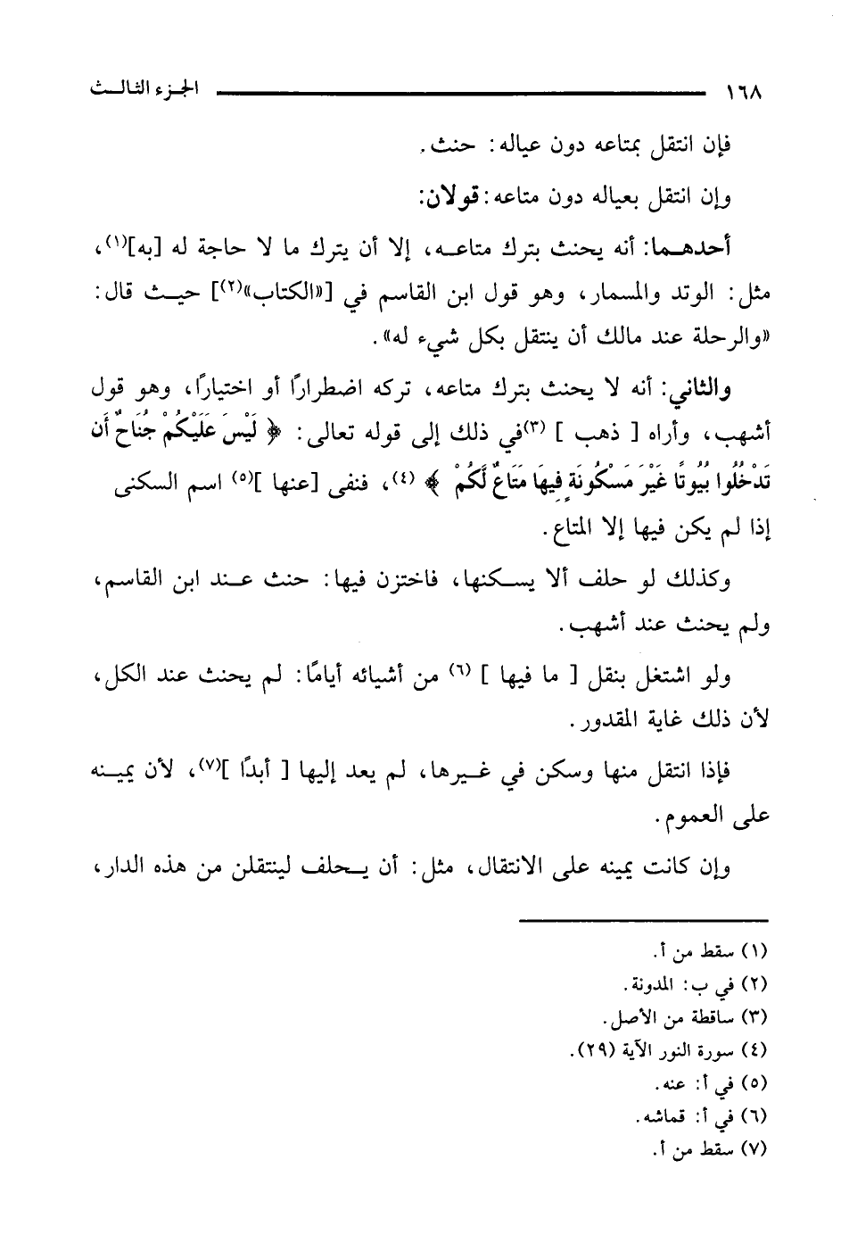 والثاني: أنه لا يحنث بترك متاعه، تركه اضطرارًا أو اختيارًا، وهو قول أشهب، وأراه [ذهب] (¬3) في ذلك إلى قوله تعالى: {لَيْسَ عَلَيْكُمْ جُنَاحٌ أَنْ تَدْخُلُوا بُيُوتًا غَيْرَ مَسْكُونَةٍ فِيهَا مَتَاعٌ لَكُمْ} (¬4)، فنفى [عنها] (¬5) اسم السكنى إذا لم يكن فيها إلا المتاع.