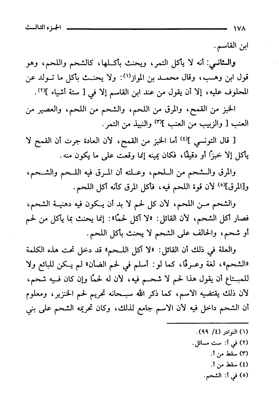 والثاني: أنه لا يأكل التمر، ويحنث بأكلها، كالشحم واللحم، وهو قول ابن وهب، وقال محمد بن المواز (¬1): ولا يحنث بأكل ما تولد عن المحلوف عليه، إلا أن يقول من عند ابن القاسم إلا في [ستة أشياء] (¬2).