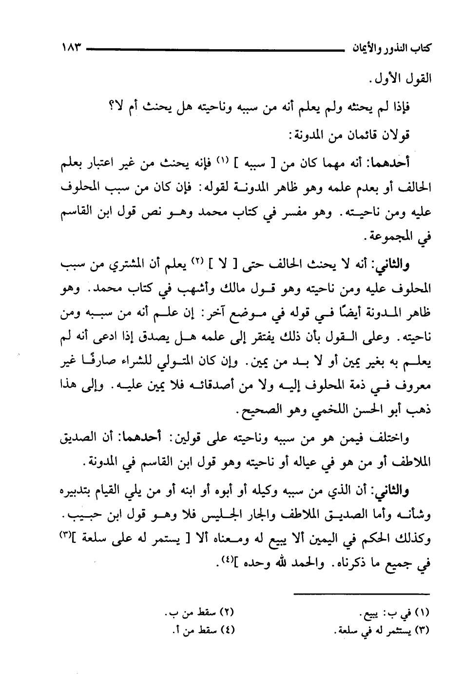 والثاني: أنه لا يحنث الحالف حتى [لا] (¬2) يعلم أن المشتري من سبب المحلوف عليه ومن ناحيته وهو قول مالك وأشهب في كتاب محمد. وهو ظاهر المدونة أيضًا في قوله في موضع آخر: إن علم أنه من سببه ومن ناحيته. وعلى القول بأن ذلك يفتقر إلى علمه هل يصدق إذا ادعى أنه لم يعلم به بغير يمين أو لابد من يمين. وإن كان المتولي للشراء صارفًا غير معروف في ذمة المحلوف إليه ولا من أصدقائه فلا يمين عليه. وإلى هذا ذهب أبو الحسن اللخمي وهو الصحيح.
