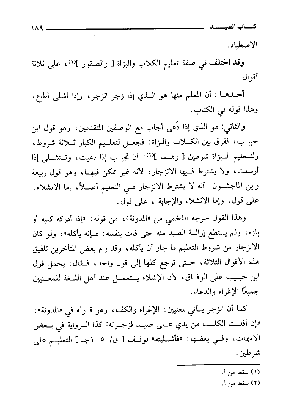 كما أن الزجر يأتي لمعنيين: الإغراء والكف، وهو قوله في "المدونة": "إن أفلت الكلب من يدي على صيد فزجرته" كذا الرواية في بعض الأمهات، وفي بعضها: "فأشليته" فوقف التعليم على شرطين.