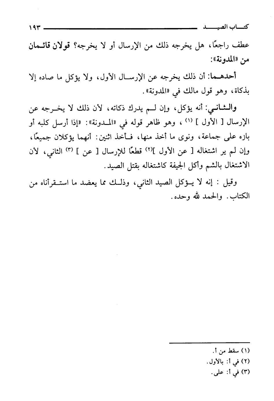 والثاني: أنه يؤكل، وإن لم يدرك ذكاته، لأن ذلك لا يخرجه عن الإرسال [الأول] (¬1)، وهو ظاهر قوله في "المدونة": "إذا أرسل كلبه أو بازه على جماعة، ونوى ما أخذ منها، فأخذ اثنين: أنهما يؤكلان جميعًا، وإن لم ير اشتغاله [عن الأول] (¬2) قطعًا للإرسال [عن] (¬3) الثاني، لأن الاشتغال بالشم وأكل الجيفة كاشتغاله بقتل الصيد.
