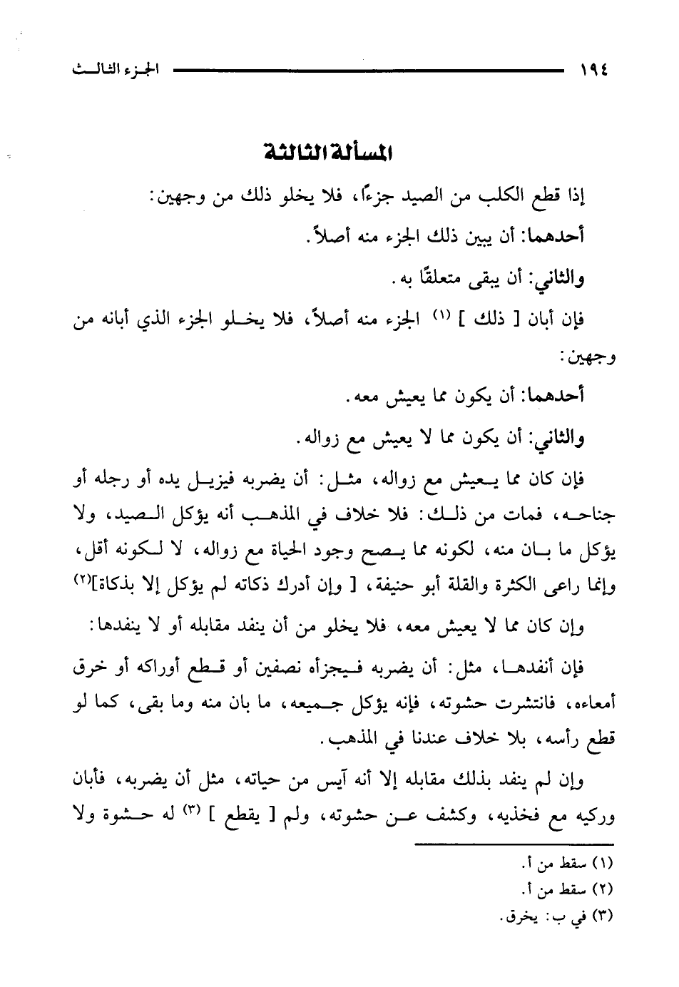 فإن كان مما يعيش مع زواله، مثل: أن يضربه فيزيل يده أو رجله أو جناحه، فمات من ذلك: فلا خلاف في المذهب أنه يؤكل الصيد، ولا يؤكل ما بان منه، لكونه مما يصح وجود الحياة مع زواله، لا لكونه أقل، وإنما راعى الكثرة والقلة أبو حنيفة، [وإن أدرك ذكاته لم يؤكل إلا بذكاة] (¬2).