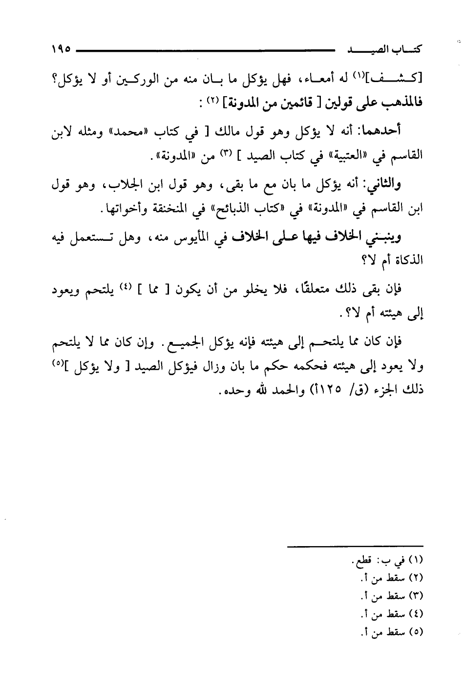 فإن كان مما يلتحم إلى هيئته فإنه يؤكل الجميع. وإن كان مما لا يلتحم ولا يعود إلى هيئته فحكمه حكم ما بان وزال فيؤكل الصيد [ولا يؤكل] (¬5) ذلك الجزء والحمد لله وحده.