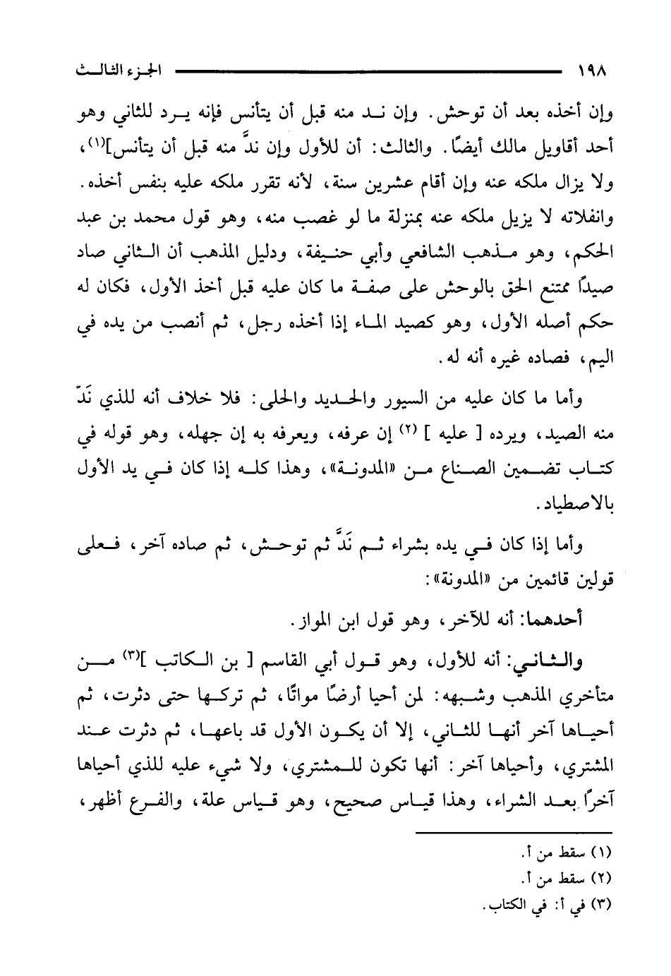 وإن أخذه بعد أن توحش. وإن ند منه قبل أن يتأنس فإنه يرد للثاني وهو أحد أقاويل مالك أيضًا. والثالث: أن للأول وإن ندَّ منه قبل أن يتأنس] (¬1)، ولا يزال ملكه عنه وإن أقام عشرين سنة، لأنه تقرر ملكه عليه بنفس أخذه. وانفلاته لا يزيل ملكه عنه بمنزلة ما لو غصب منه، وهو قول محمد بن عبد الحكم، وهو مذهب الشافعي وأبي حنيفة، ودليل المذهب أن الثاني صاد صيدًا ممتنع الحق بالوحش على صفة ما كان عليه قبل أخذ الأول، فكان له حكم أصله الأول، وهو كصيد الماء إذا أخذه رجل، ثم أنصب من يده في اليم، فصاده غيره أنه له.