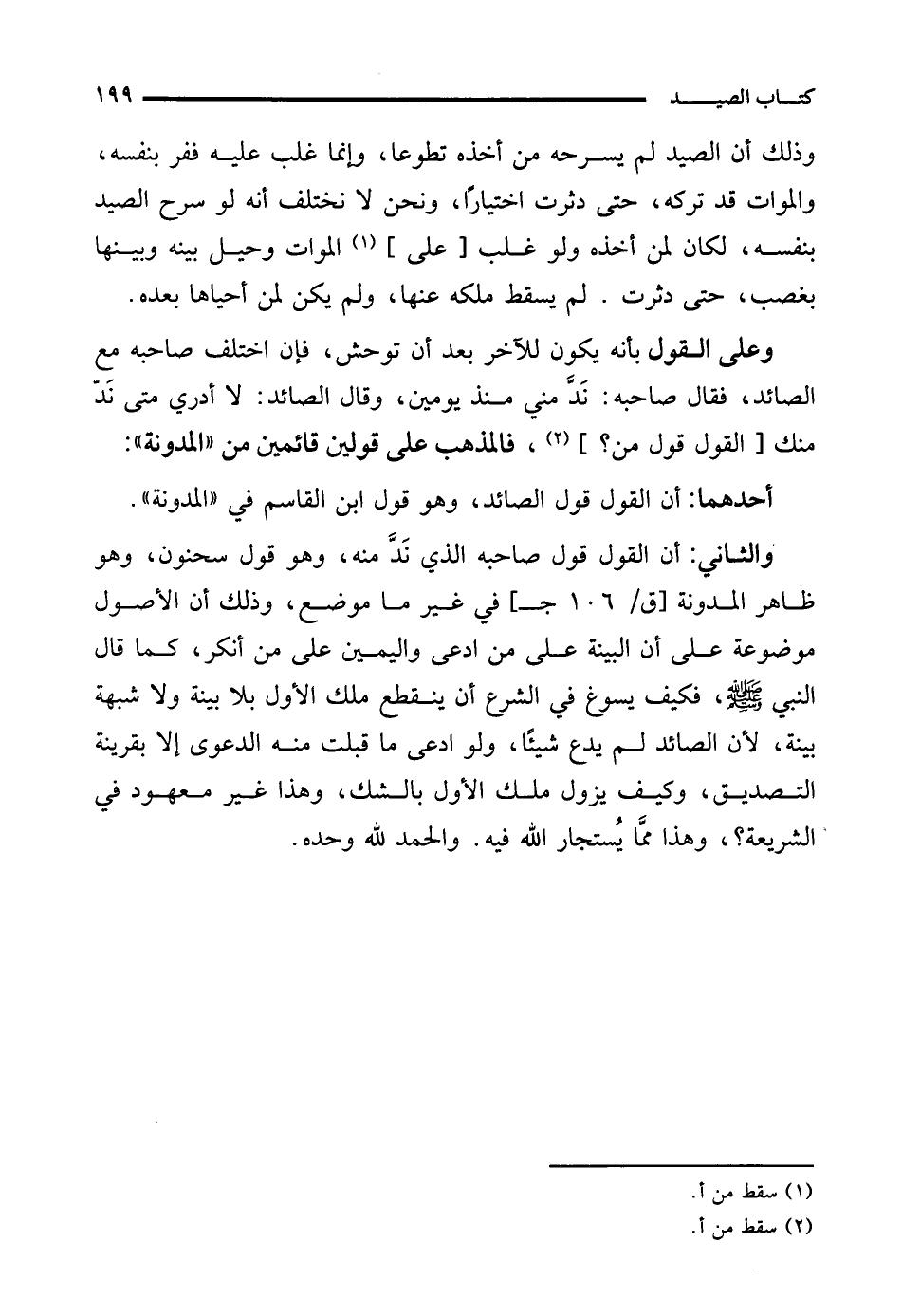 والثاني: أن القول قول صاحبه الذي نَدَّ منه، وهو قول سحنون، وهو ظاهر المدونة في غير ما موضع، وذلك أن الأصول موضوعة على أن البينة على من ادعى واليمين على من أنكر، كما قال النبي - صلى الله عليه وسلم -، فكيف يسوغ في الشرع أن ينقطع ملك الأول بلا بينة ولا شبهة بينة، لأن الصائد لم يدع شيئًا، ولو ادعى ما قبلت منه الدعوى إلا بقرينة التصديق، وكيف يزول ملك الأول بالشك، وهذا غير معهود في الشريعة؟، وهذا ممَّا يُستجار الله فيه. والحمد لله وحده.