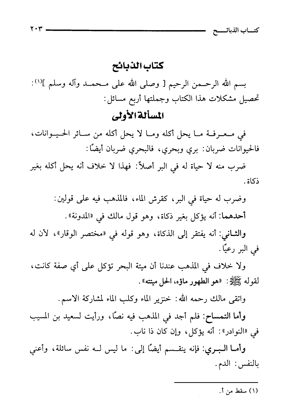 في معرفة ما يحل أكله وما لا يحل أكله من سائر الحيوانات، فالحيوانات ضربان: بري وبحري، فالبحري ضربان أيضًا:
