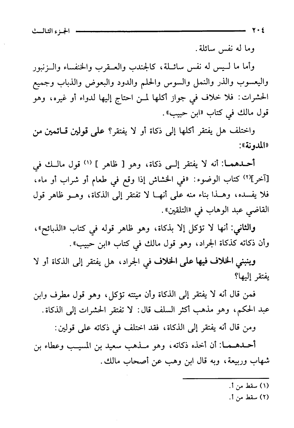 فمن قال أنه لا يفتقر إلى الذكاة وأن ميتته تؤكل، وهو قول مطرف وابن عبد الحكم، وهو مذهب أكثر السلف قال: لا تفتقر الحشرات إلى الذكاة.