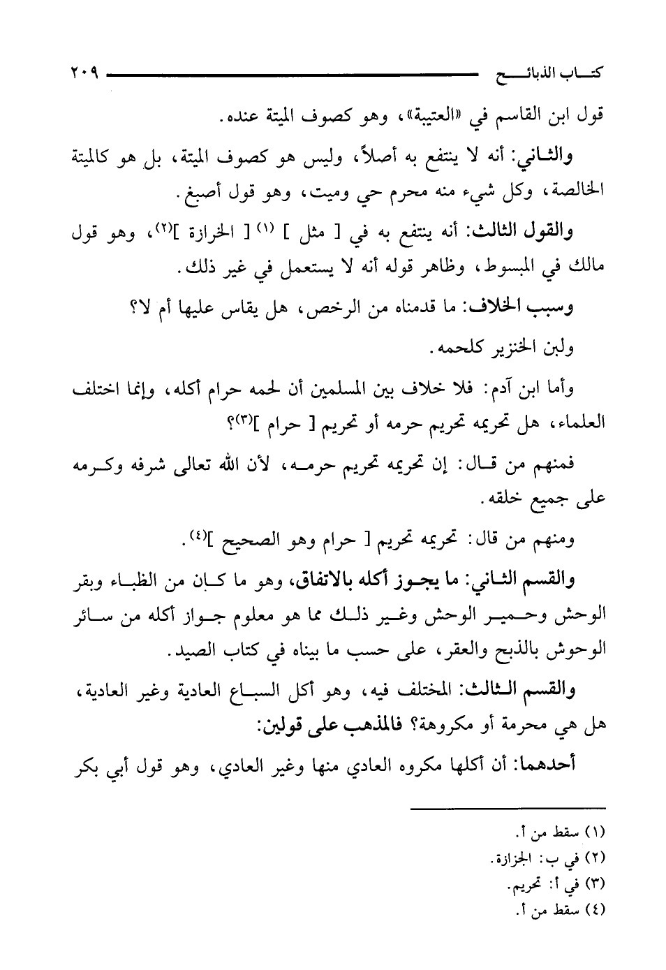 والقسم الثالث: المختلف فيه، وهو أكل السباع العادية وغير العادية، هل هي محرمة أو مكروهة؟ فالمذهب على قولين: