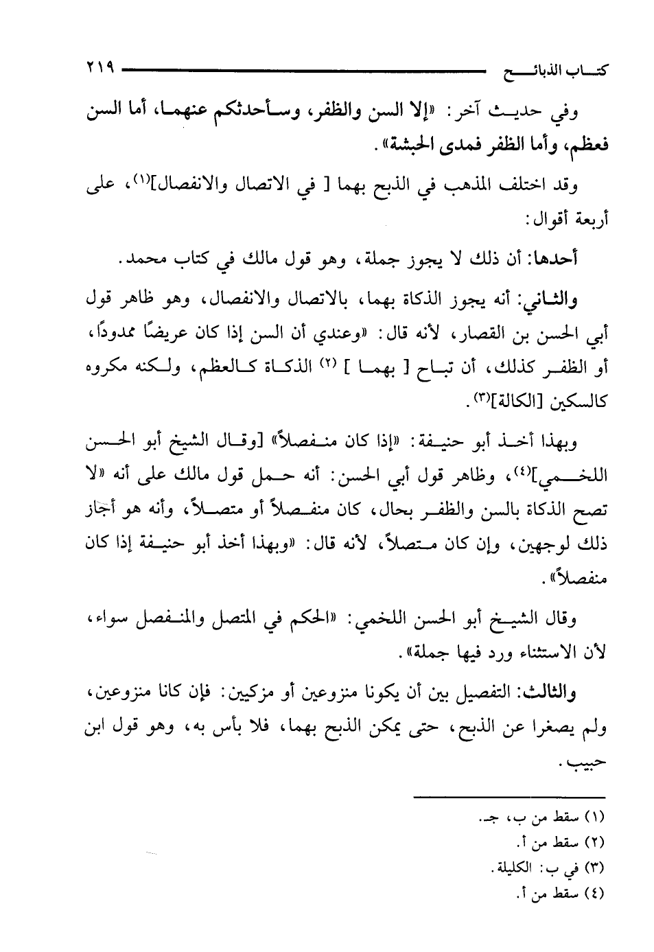 والثالث: التفصيل بين أن يكونا منزوعين أو مزكيين: فإن كانا منزوعين، ولم يصغرا عن الذبح، حتى يمكن الذبح بهما، فلا بأس به، وهو قول ابن حبيب.
