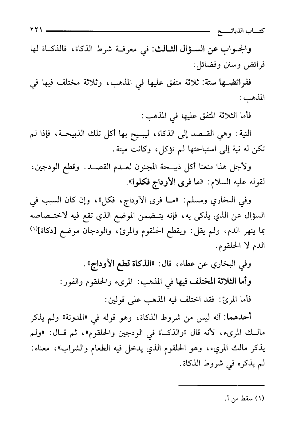 ولأجل هذا منعنا أكل ذبيحة المجنون لعدم القصد. وقطع الودجين، لقوله عليه السلام: "ما فرى الأوداج فكلوا".