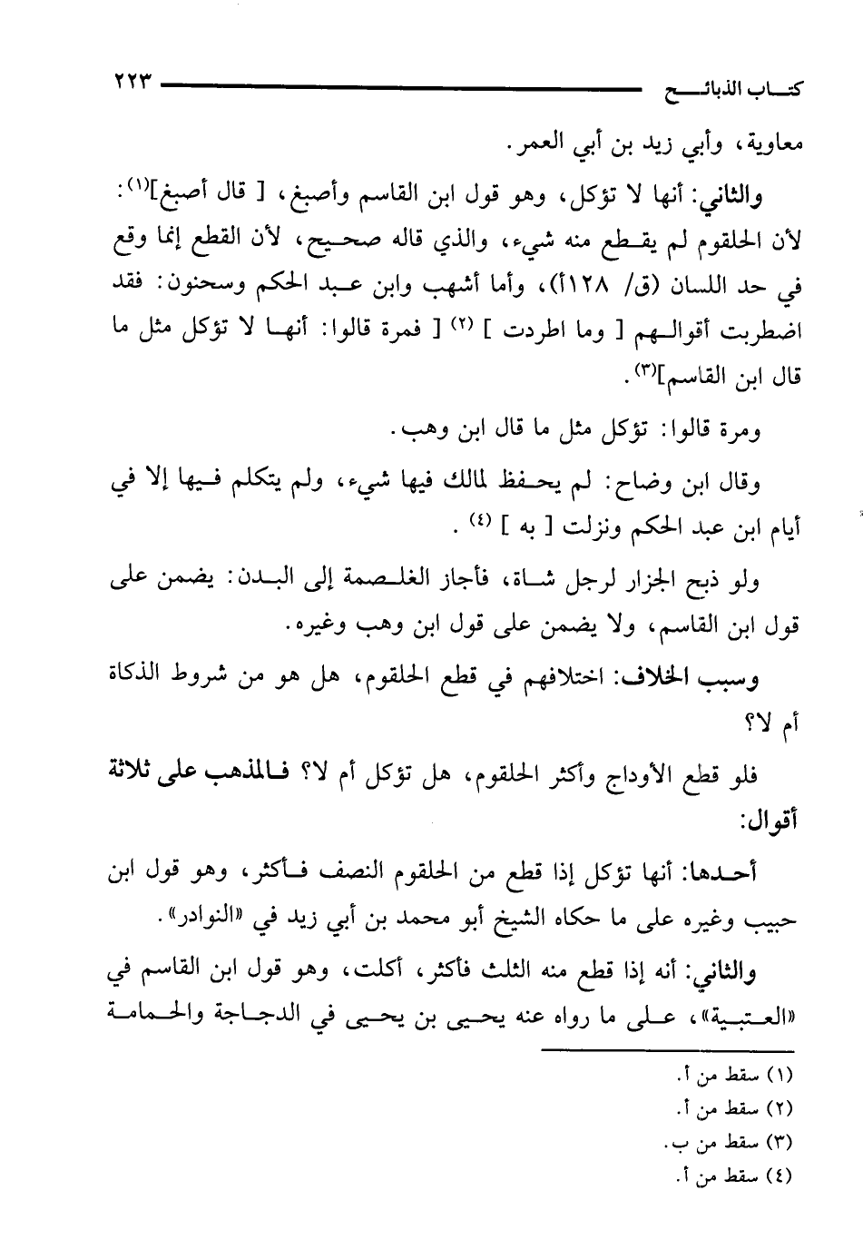 والثاني: أنها لا تؤكل، وهو قول ابن القاسم وأصبغ، [قال أصبغ] (¬1): لأن الحلقوم لم يقطع منه شيء، والذي قاله صحيح، لأن القطع إنما وقع في حد اللسان، وأما أشهب وابن عبد الحكم وسحنون: فقد اضطربت أقوالهم [وما اطردت] (¬2) [فمرة قالوا: أنها لا تؤكل مثل ما قال ابن القاسم] (¬3).