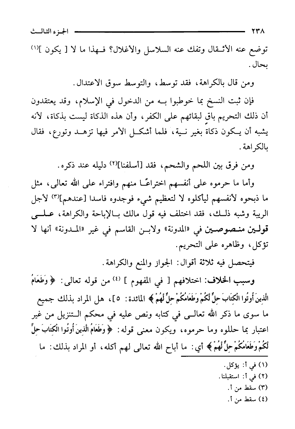 فإن ثبت النسخ بما خوطبوا به من الدخول في الإسلام، وقد يعتقدون أن ذلك التحريم باقٍ لبقائهم على الكفر، وأن هذه الذكاة ليست بذكاة، لأنه يشبه أن يكون ذكاة بغير نية، فلما أشكل الأمر فيها تزهد وتورع، فقال بالكراهة.