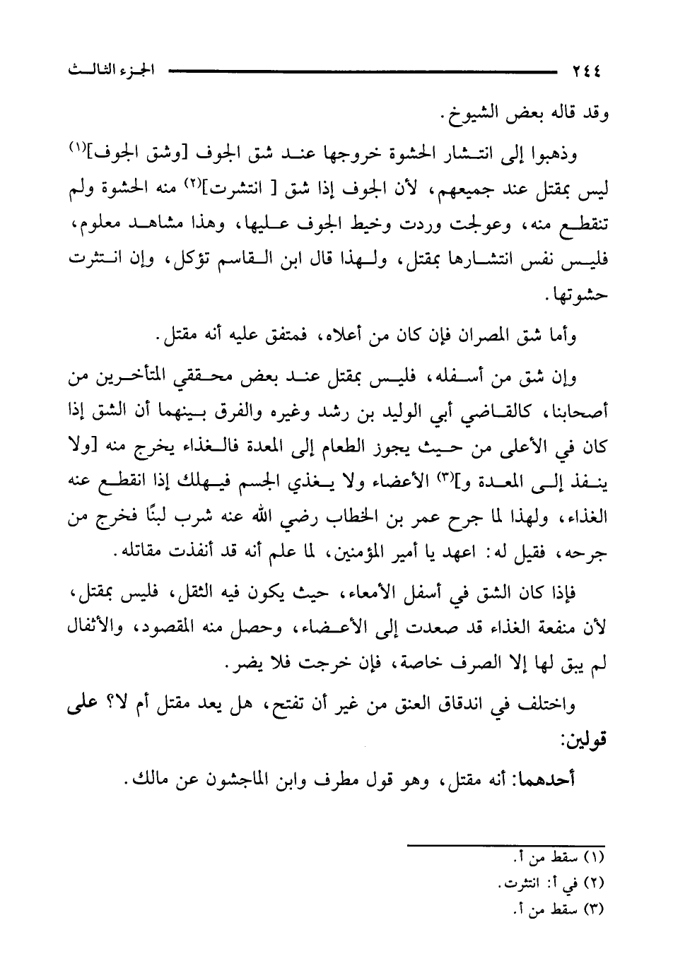 وإن شق من أسفله، فليس بمقتل عند بعض محققي المتأخرين من أصحابنا، كالقاضي أبي الوليد بن رشد وغيره والفرق بينهما أن الشق إذا كان في الأعلى من حيث يجوز الطعام إلى المعدة فالغذاء يخرج منه [ولا ينفذ إلى المعدة و] (¬3) الأعضاء ولا يغذي الجسم فيهلك إذا انقطع عنه الغذاء، ولهذا لما جرح عمر بن الخطاب رضي الله عنه شرب لبنًا فخرج من جرحه، فقيل له: اعهد يا أمير المؤمنين، لما علم أنه قد أنفذت مقاتله.