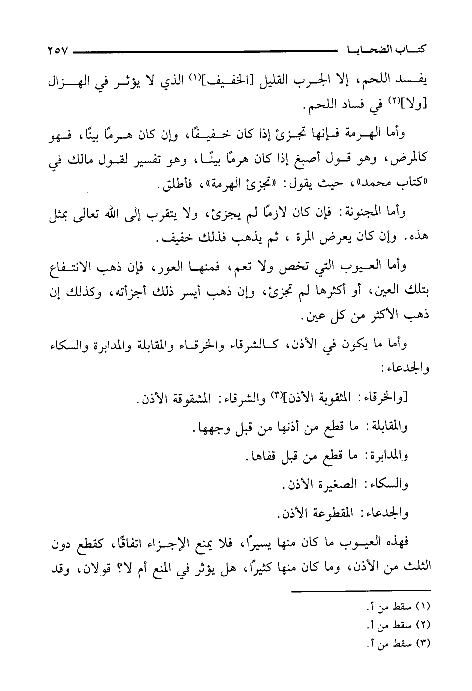 وأما ما يكون في الأذن، كالشرقاء والخرقاء والمقابلة والمدابرة والسكاء والجدعاء:
