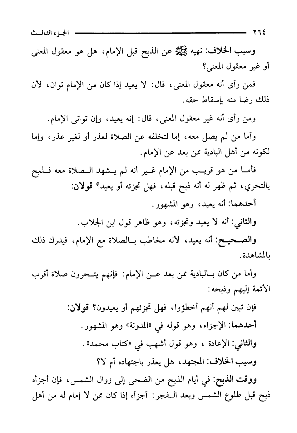 وسبب الخلاف: نهيه - صلى الله عليه وسلم - عن الذبح قبل الإمام، هل هو معقول المعنى أو غير معقول المعنى؟