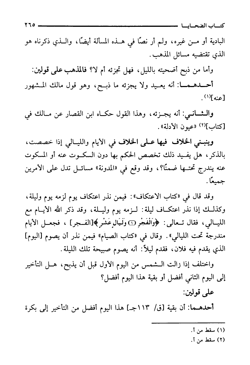 وأما من ذبح أضحيته بالليل، فهل تجزئه أم لا؟ فالمذهب على قولين:
