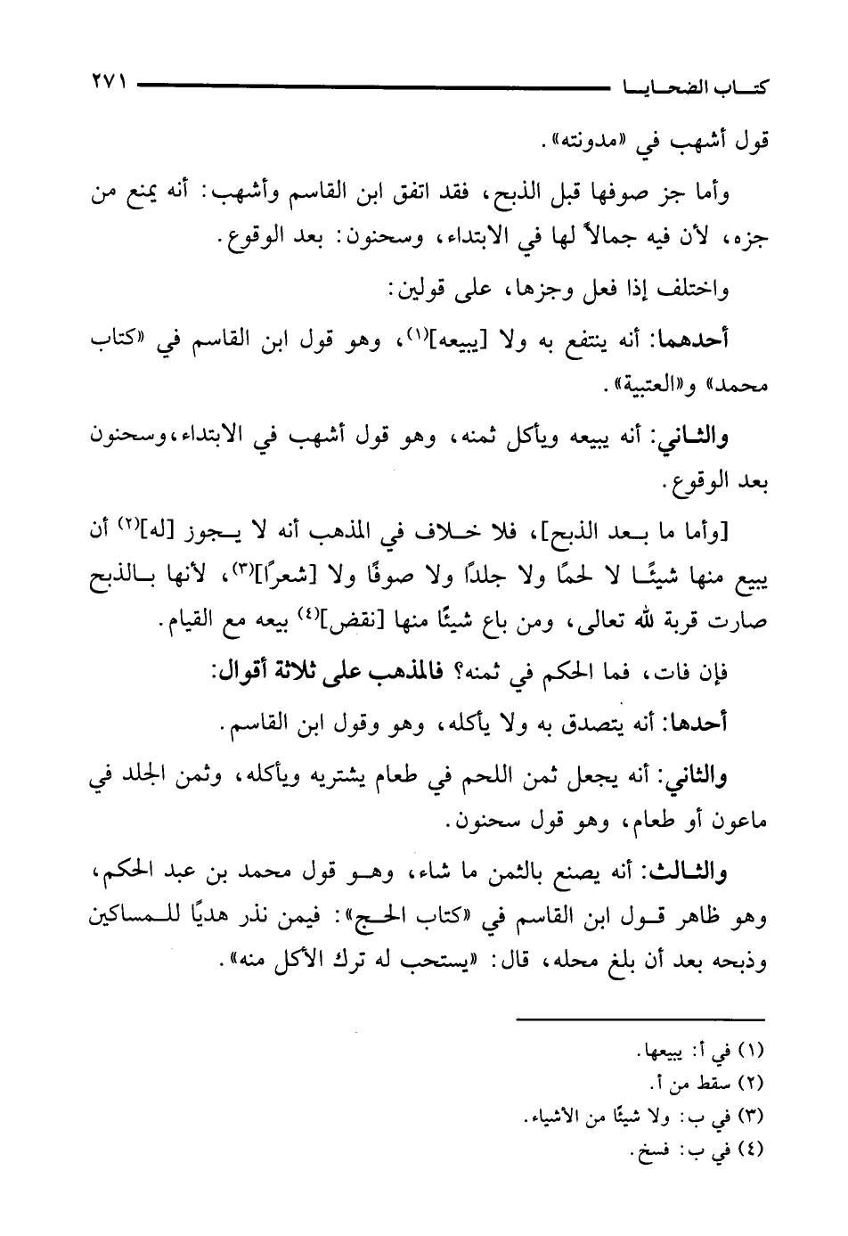 وأما جز صوفها قبل الذبح، فقد اتفق ابن القاسم وأشهب: أنه يمنع من جزه، لأن فيه جمالًا لها في الابتداء، وسحنون: بعد الوقوع.
