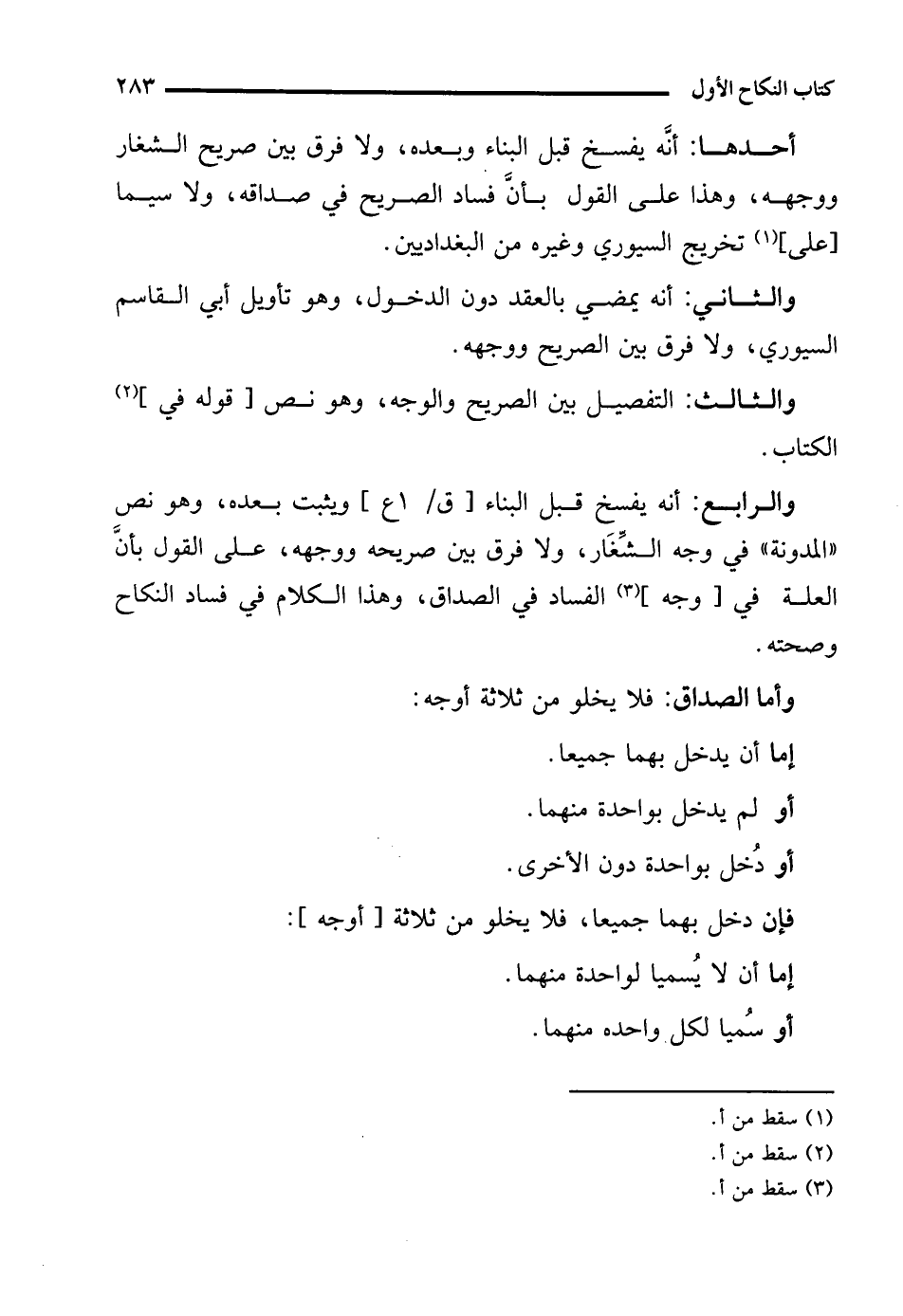 والرابع: أنه يفسخ قبل البناء ويثبت بعده، وهو نص "المدونة" في وجه الشِّغَار، ولا فرق بين صريحه ووجهه، على القول بأنَّ العلة في [وجه] (¬3) الفساد في الصداق، وهذا الكلام في فساد النكاح وصحته.