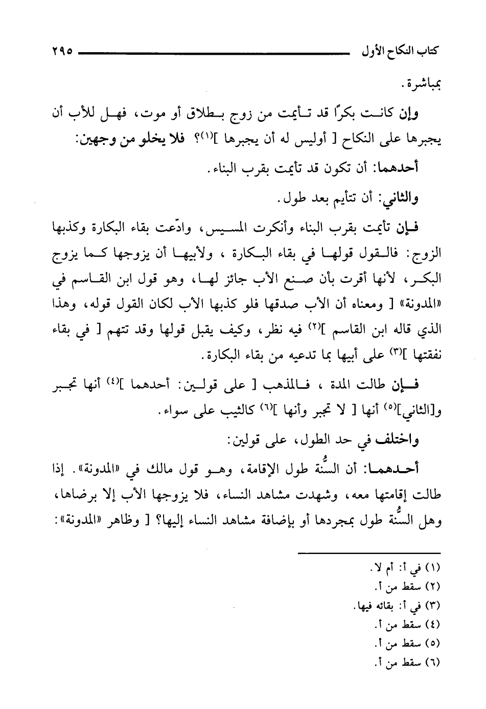 أحدهما: أن السُّنة طول الإقامة، وهو قول مالك في "المدونة". إذا طالت إقامتها معه، وشهدت مشاهد النساء، فلا يزوجها الأب إلا برضاها، وهل السُّنة طول بمجردها أو بإضافة مشاهد النساء إليها؟ [وظاهر "المدونة":