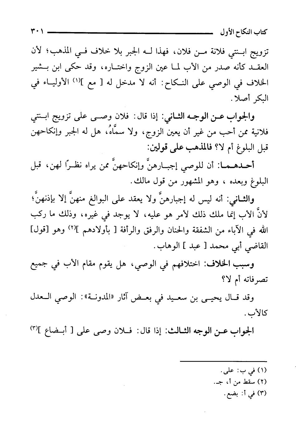 والجواب عن الوجه الثاني: إذا قال: فلان وصى على تزويج ابنتي فلانية ممن أحب من غير أن يعين الزوج، ولا سمَّاهُ، هل له الجبر وإنكاحهن قبل البلوغ أم لا؟ فالمذهب على قولين:
