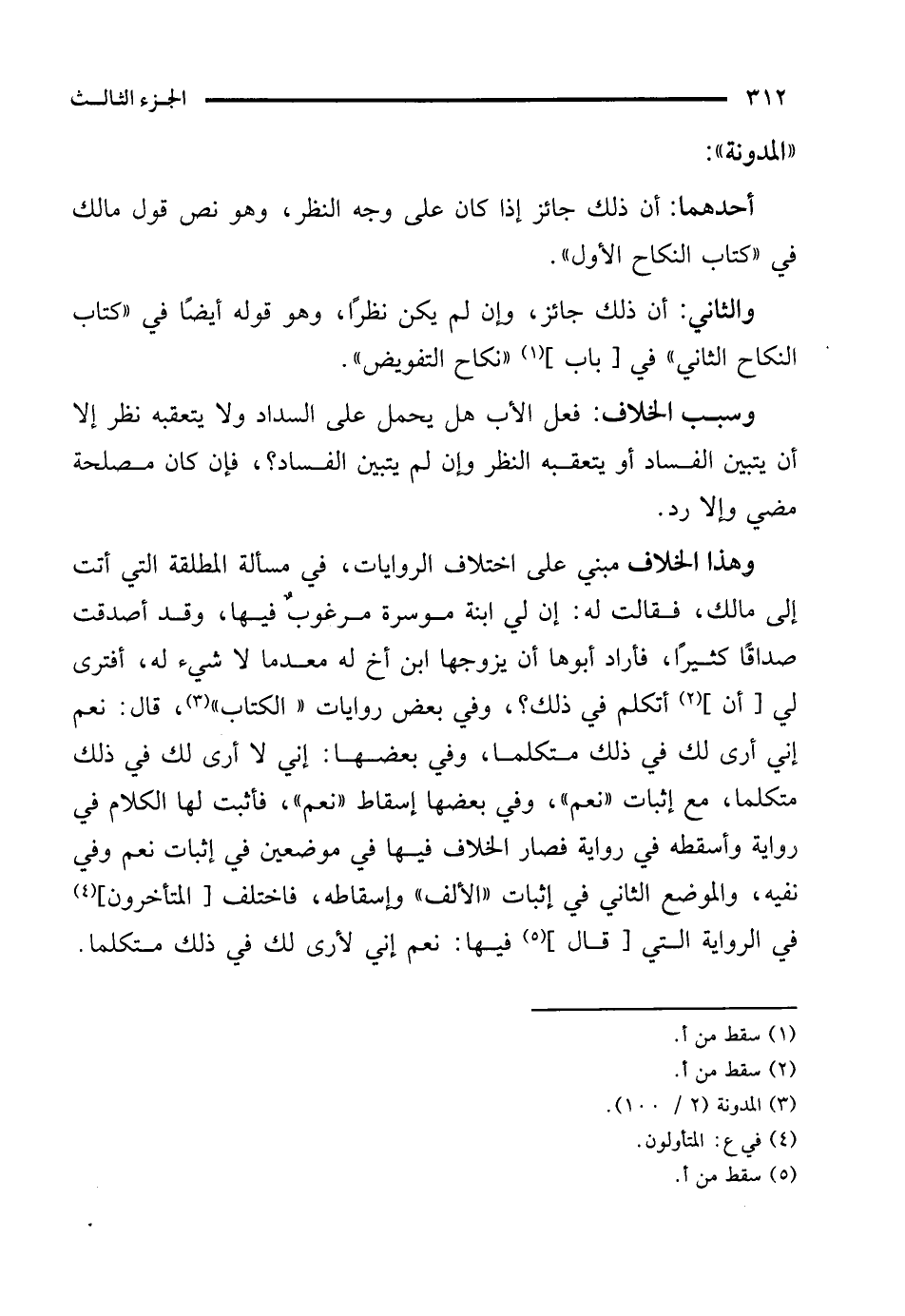 وهذا الخلاف مبني على اختلاف الروايات، في مسألة المطلقة التي أتت إلى مالك، وقالت له: إن لي ابنة موسرة مرغوبٌ فيها، وقد أصدقت صداقًا كثيرًا، فأراد أبوها أن يزوجها ابن أخ له معدما لا شيء له، أفترى لي [أن] (¬2) أتكلم في ذلك؟، وفي بعض روايات "الكتاب" (¬3)، قال: نعم إني أرى لك في ذلك متكلما، وفي بعضها: إني لا أرى لك في ذلك متكلما، مع إثبات "نعم"، وفي بعضها إسقاط "نعم"، فأثبت لها الكلام في رواية وأسقطه في رواية فصار الخلاف فيها في موضعين في إثبات نعم وفي نفيه، والموضع الثاني في إثبات "الألف" وإسقاطه، فاختلف [المتأخرون] (¬4) في الرواية التي [قال] (¬5) فيها: نعم إني لأرى لك في ذلك متكلما.